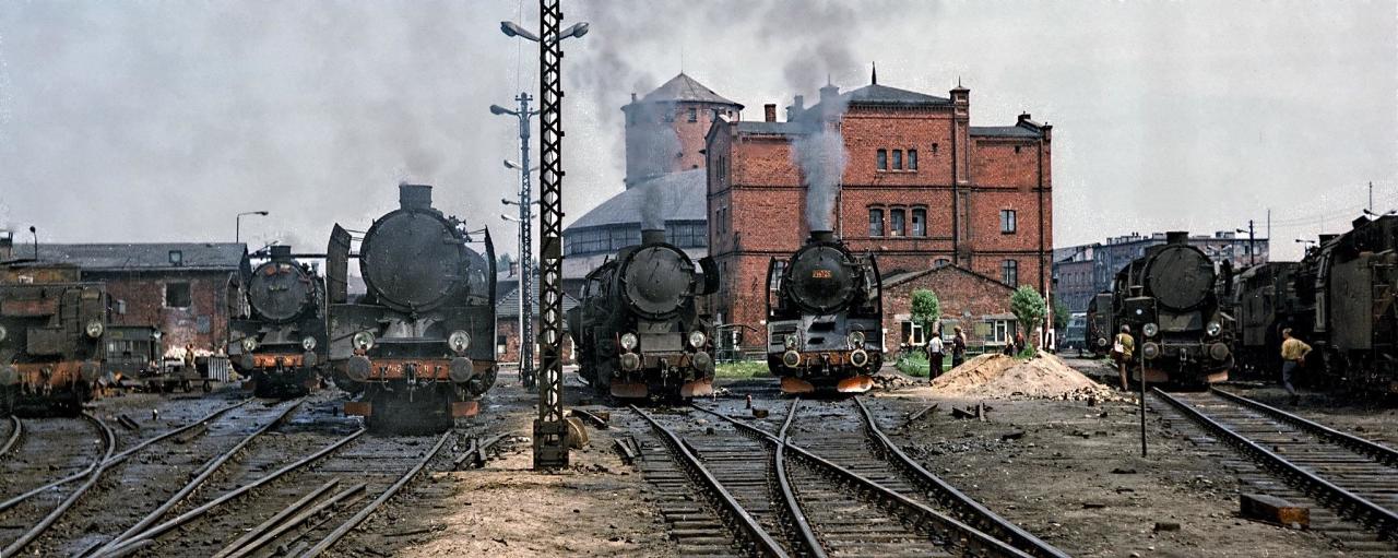 Zaplecze trakcyjne Bydgoszczy Głównej w pierwszej połowie lat 70. XX wieku. W tle parowozownia - okrąglak. Widok w kierunku wschodnim, od strony wjazdów z Nakła nad Notecią, Szubina/Poznania, Inowrocławia (przez Brzozę Bydgoską).
