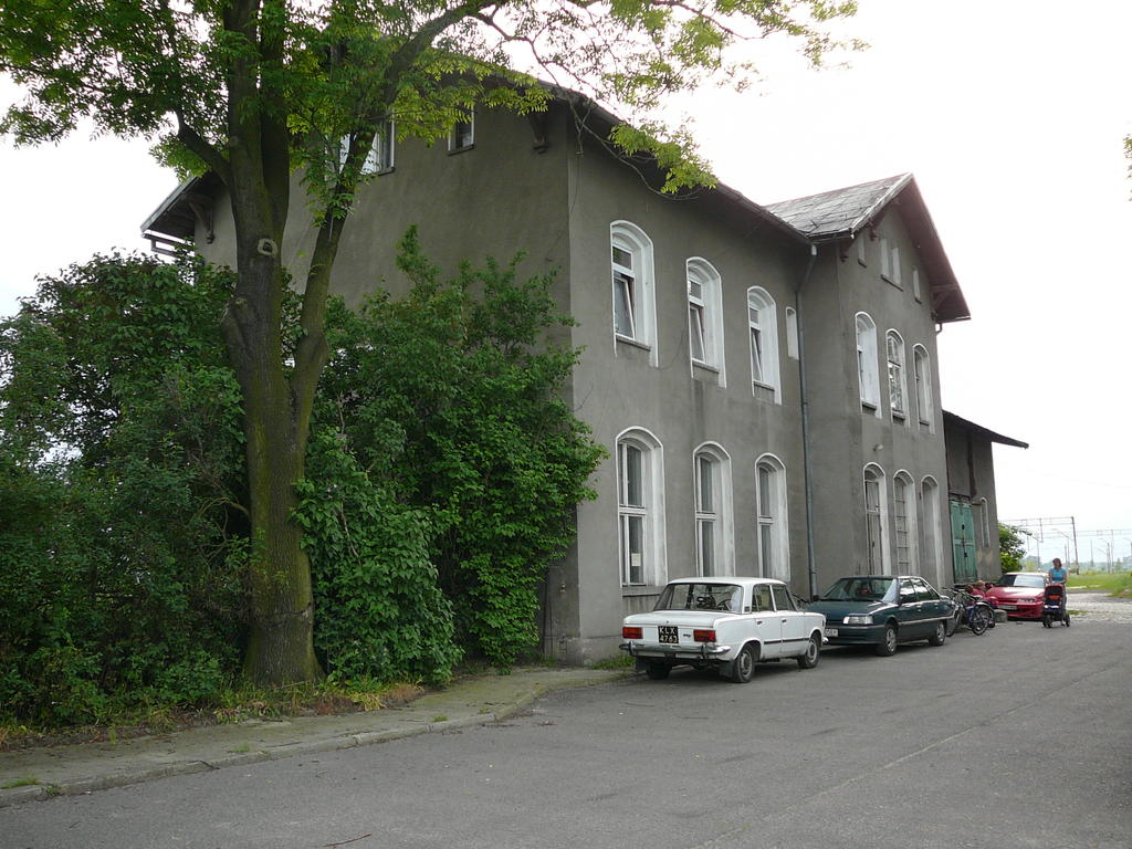 Kolejowy budynek mieszkalny od strony peronów. W lewo dworzec, w prawo Kluczbork.