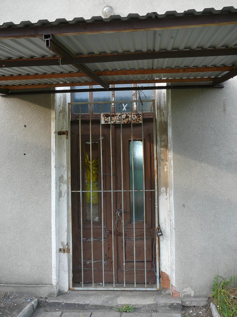 Zamknięte wejście do budynku dworcowego. Widok od strony torów. Tablica z informacjami od POLREGIO na budynku dworcowym. W lewo Kępno/Poznań Główny, w prawo Kluczbork.