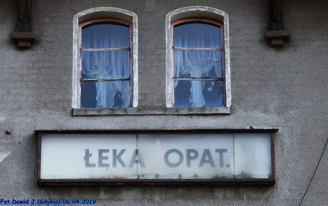 Łęka Opatowska. Rozkład jazdy na sklejce w oknie budynku dworca.