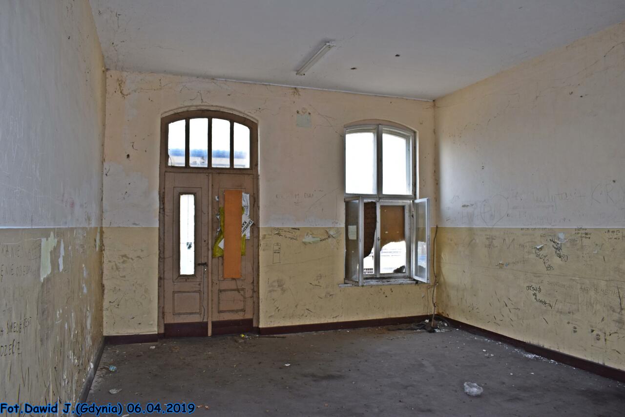 Wnętrze budynku dworcowego. Nieczynna zdewastowana poczekalnia. Wyjście na perony.