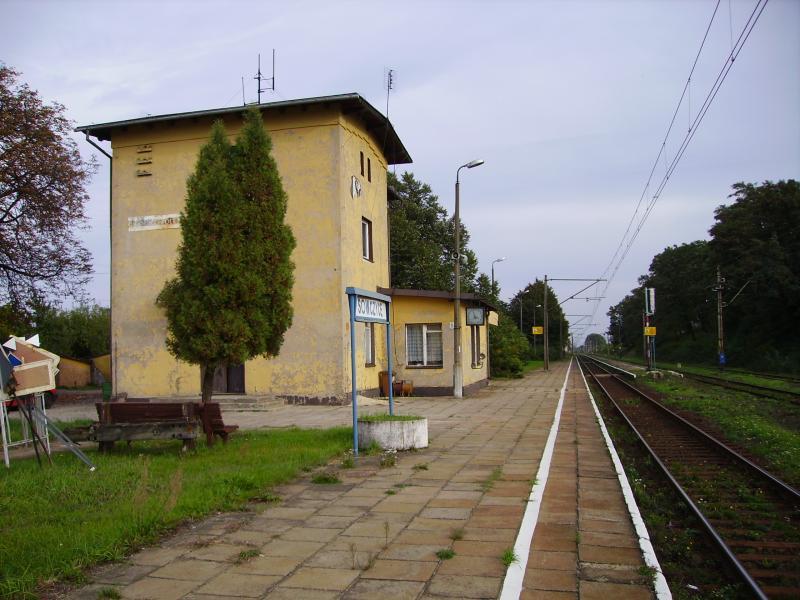 Sowczyce. Widok ogólny na stację od strony Lublińca. W tle budynek dworca. Na parterze mieści się nastawnia dysponująca.
