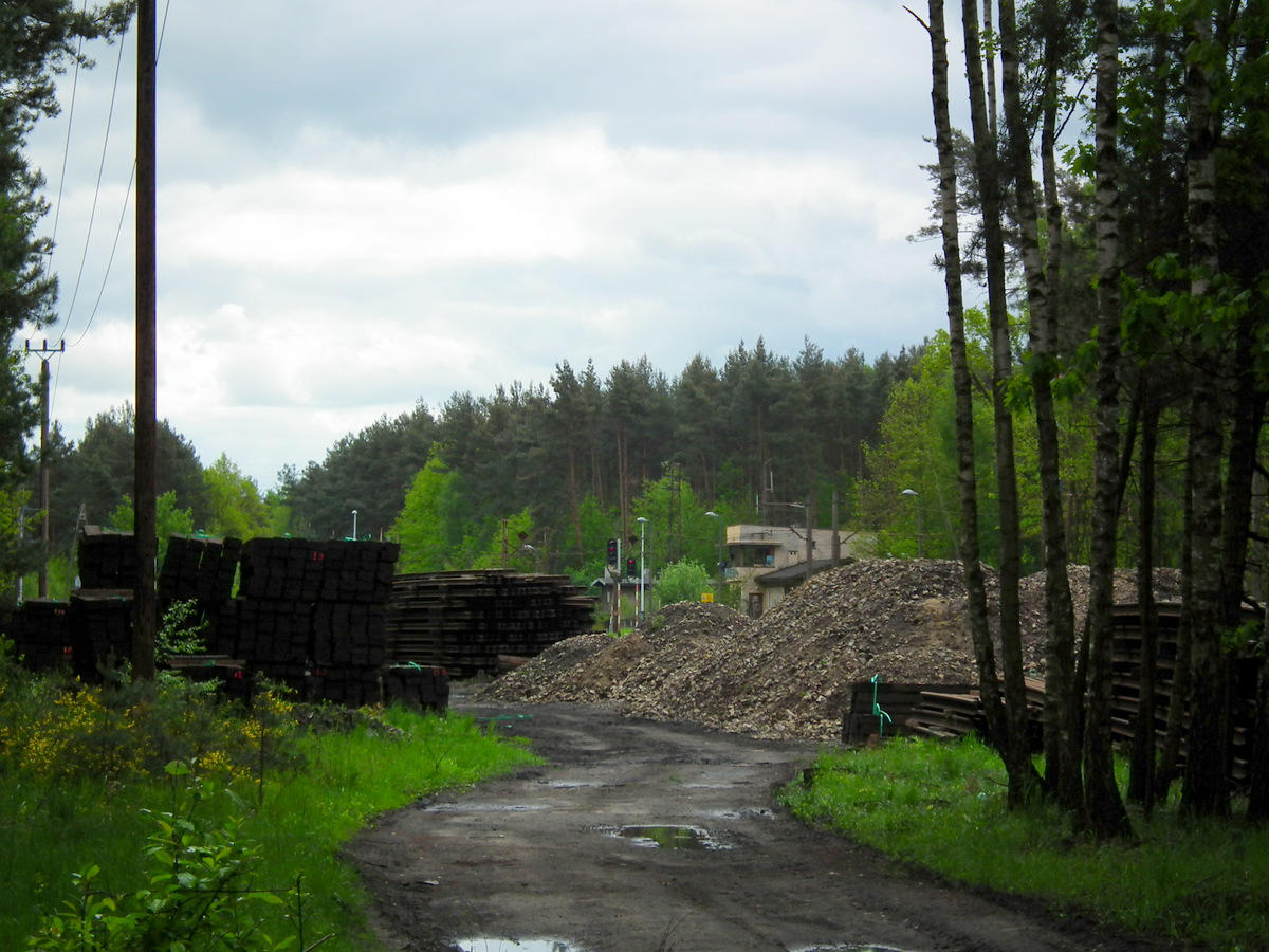 W związku z modernizacją linii, plac składowy zastawiony materiałem nawierzchniowym. W tle nastawnia dysponująca. Widok od strony Kluczborka.