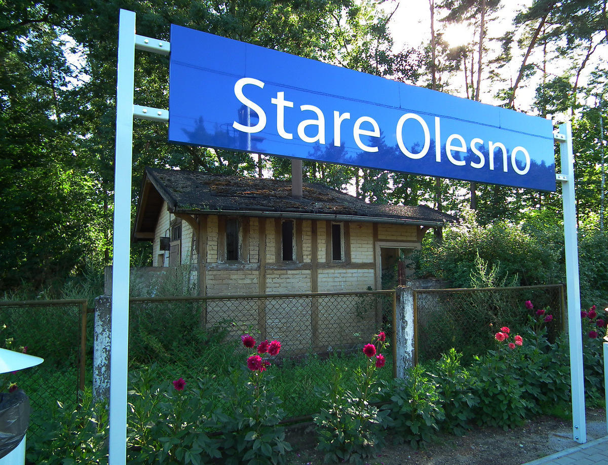 Jedna z dwóch tablic z nazwą stacji w Starym Oleśnie.