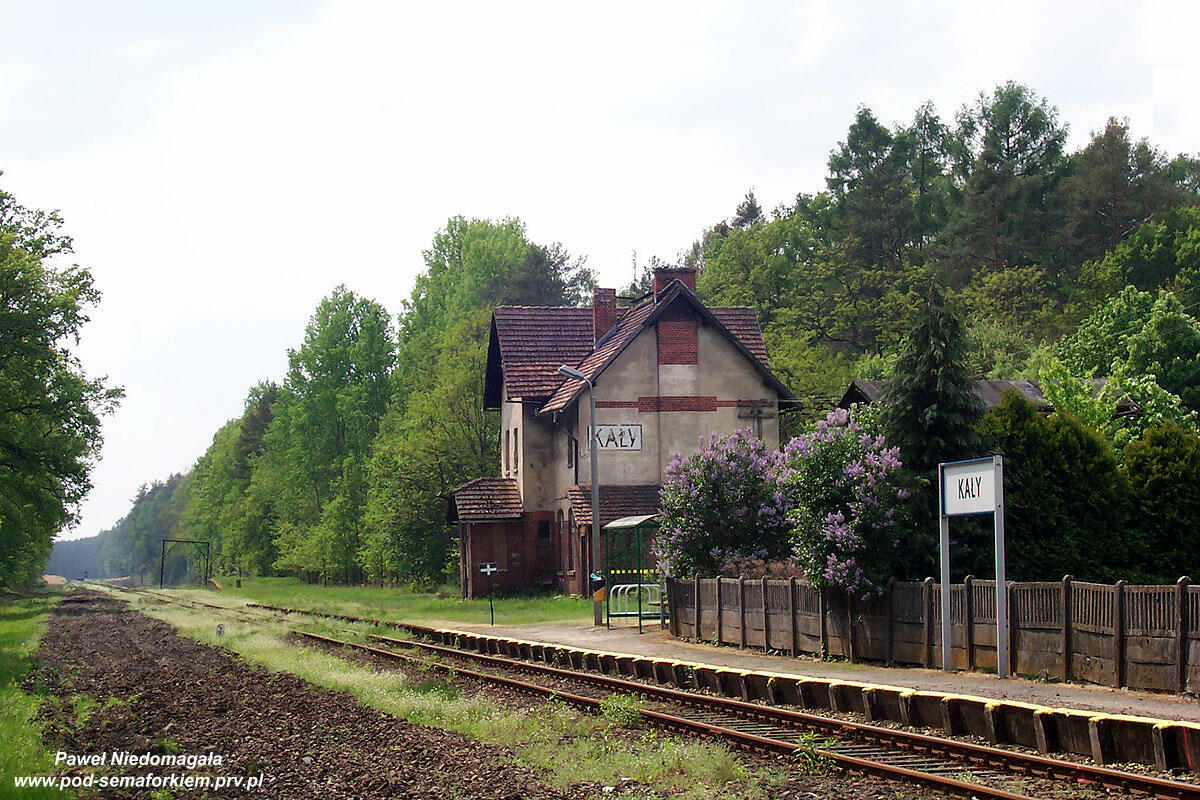 Kały. Peron, budynek mieszkalny oraz budynek dworca. Widok w kierunku Opola.