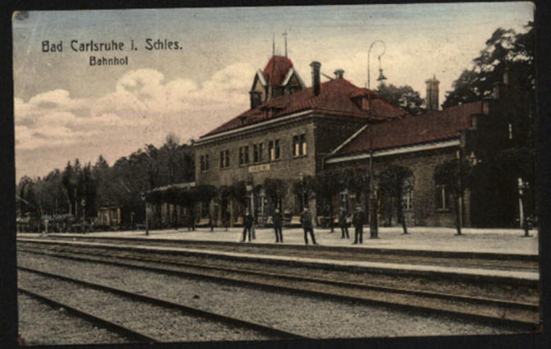 Budynek dworca od strony peronów. W lewo Jełowa/Opole, w prawo Namysłów. Stara pocztówka.