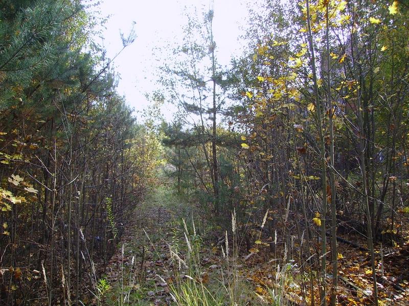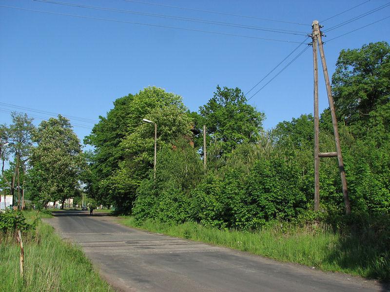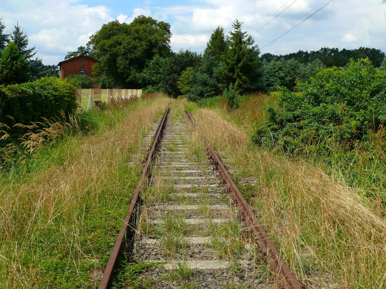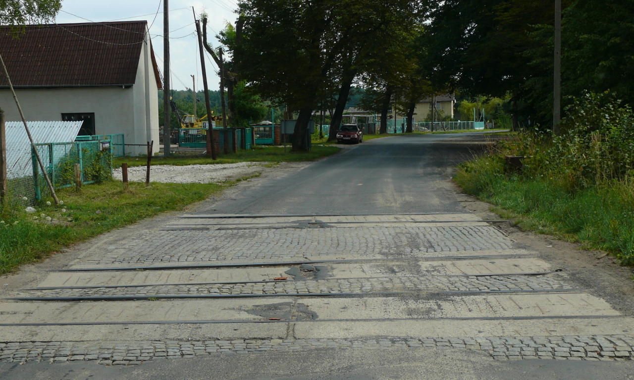 Przejazd kolejowy w Pokoju. Po prawej stronie, niewidoczna, ukryta w krzakach wieża i parowozownia. Całe torowisko i teren parowozowni są gęsto zarośnięte, a w zwiedzaniu przeszkadzają niebezpieczne pszczoły z pobliskich uli:). W prawo dworzec i perony, w lewo Namysłów.