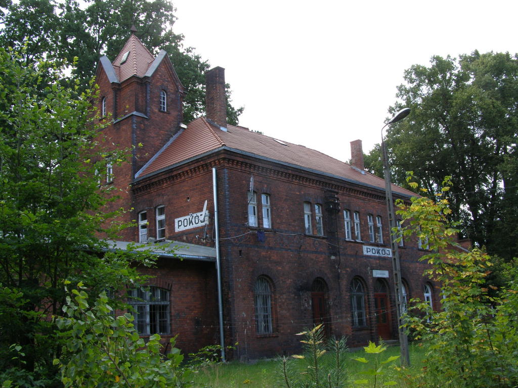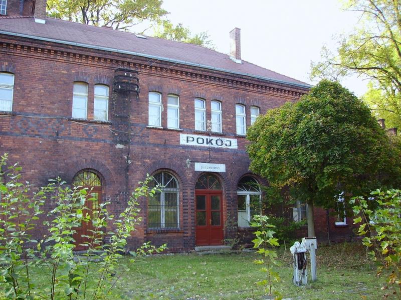 Ukryta w małym lasku stacja Pokój. Dawny dworzec, obecnie budynek mieszkalny. Zachował się, nieopodal, przystanek autobusowy o nazwie "Stacja PKP".