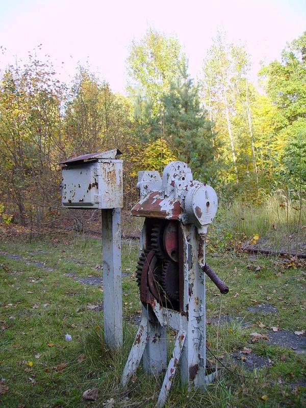 Mechanizm podnoszenia rogatek przejazdowych na peronie. W lewo Namysłów, w prawo Jełowa/Opole.