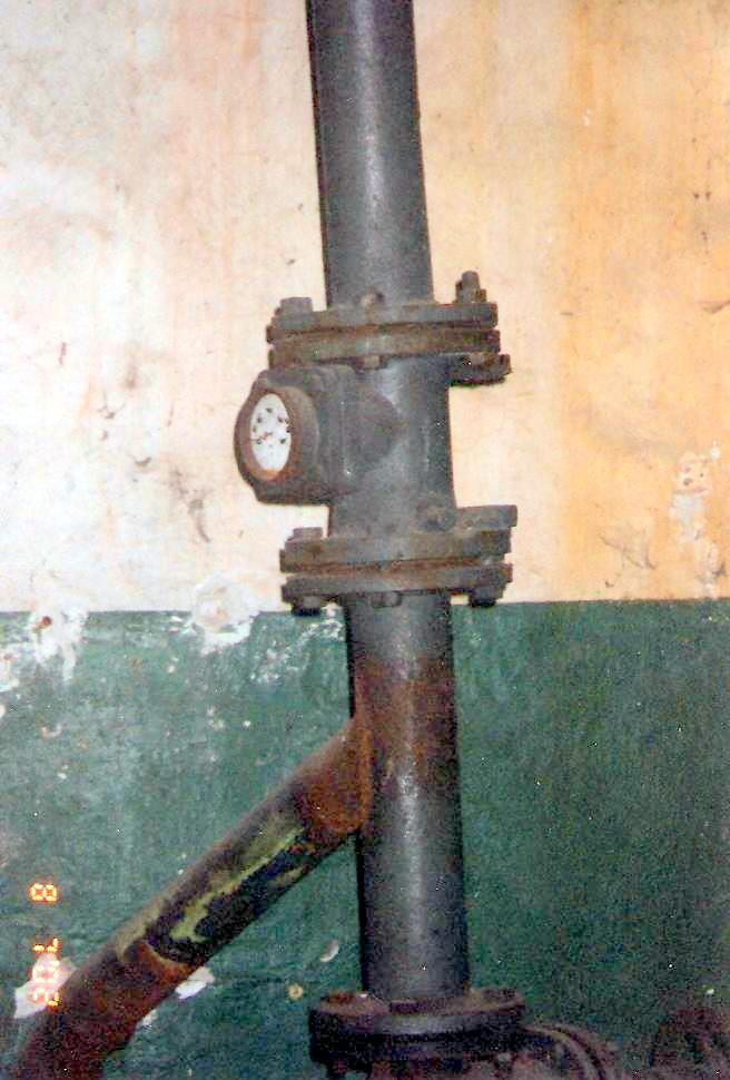 Pokój. Wskaźnik poziomu wody w zbiorniku wody wieży wodnej ze strzałką (na dole) i kółkiem napędu w górnej części.