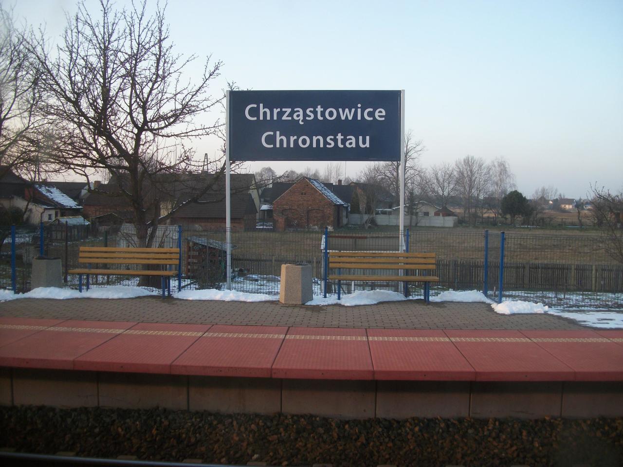 Dwujęzyczna tablica z nazwą stacji/mijanki - Chrząstowice - Chronstau. Warto wspomnieć, że gmina Chrząstowice to jedyna gmina w Polsce, która nawet na Kolei ma tablice dwujęzyczne. A szkoda, (że tylko jedyna)…
