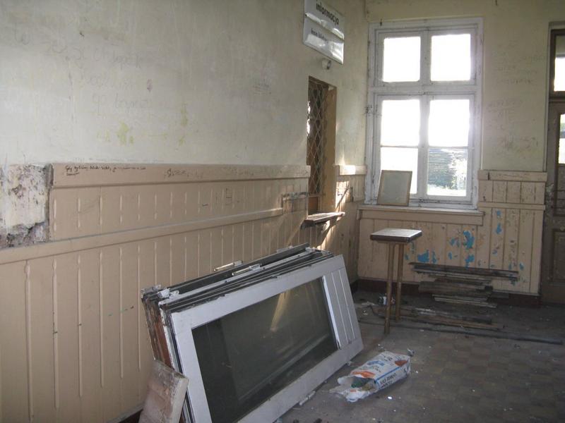 Zamknięta poczekalnia pełniąca najwyraźniej rolę "śmietniska" dla odpadów budowlanych.