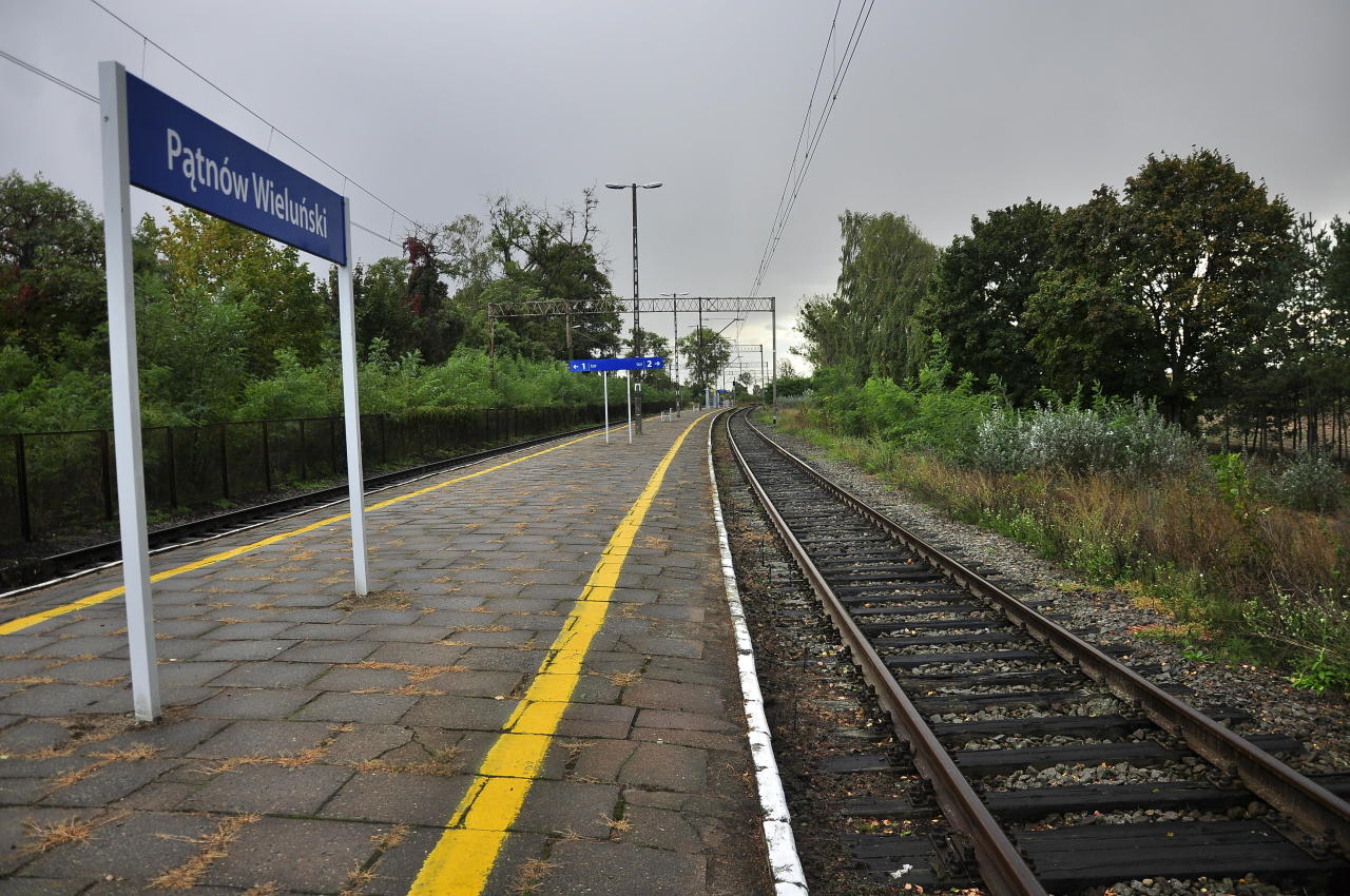 Jedyny czynny peron na stacji w Pątnowie. Widoczny łuk torów i co za tym idzie peronu. Widok w stronę Wielunia.