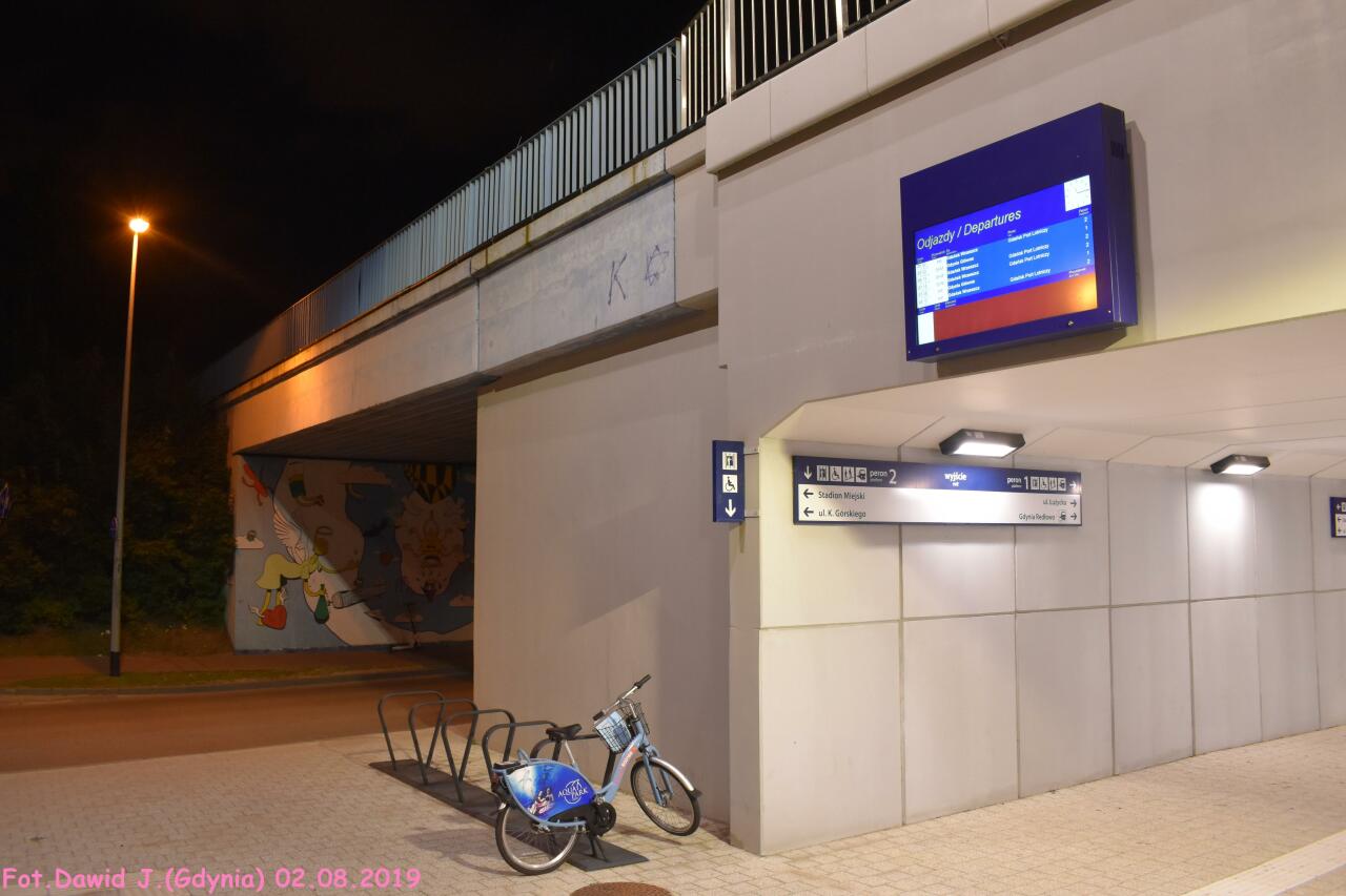 Grafika perforacji na ozdobnej czerwonej wiacie przystanku Gdynia Stadion nawiązuje do dyscyplin sportowych uprawianych na obiektach sąsiadujących z koleją. W lewo Gdańsk Osowa/Bydgoszcz Główna, w prawo Gdynia Główna.