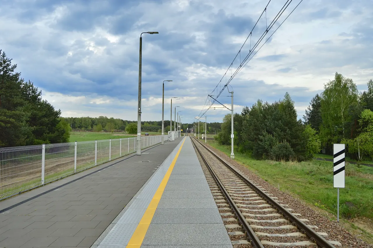 Nowy przystanek na linii 182, zaprojektowany i zbudowany przy okazji rewitalizacji. W poprzedniej wersji w tym miejscu był tylko przejazd kolejowy i pole. Śmiem wątpić, czy będą tu tłumy wsiadały i wysiadały; trochę tu daleko zewsząd. W marcu 2021 w tym miejscu jest tylko kawałek placu na którym ułożono drewno, pewnie pozbierane w trakcie oczyszczania linii. Do końca lata 2022 na wschód od ulicy Wspólnej powstał peron przystanku. (zobaczył Wojciech Gross, 2022-10-31). |