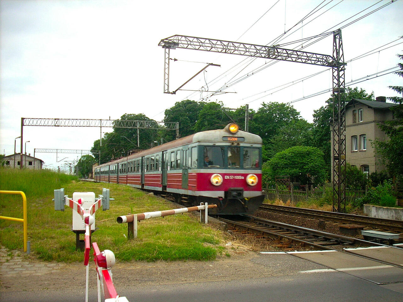 EN57-1095 jako pociąg Bydgoszcz Główna - Tczew wyjeżdża ze stacji Kotomierz. Zdjęcie wykonane na przejeździe drogowo-kolejowym z drogą nr 56.
