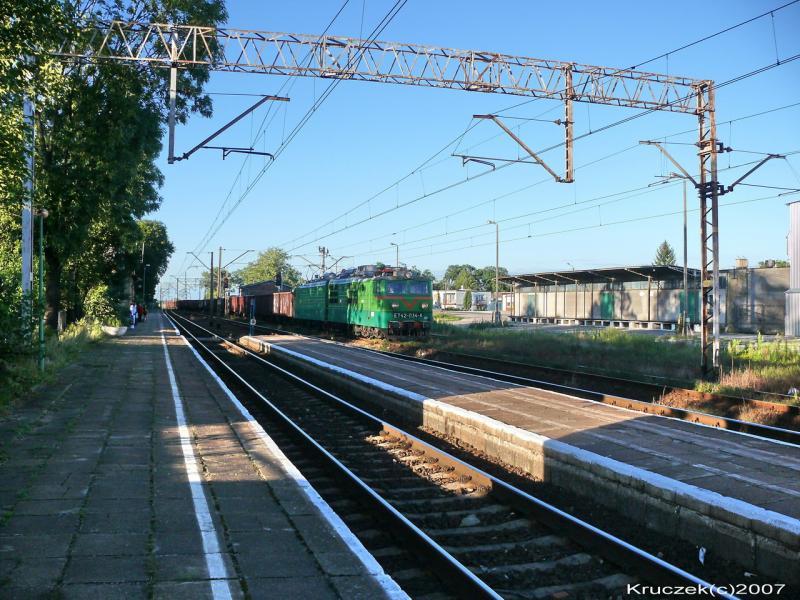 Kotomierz. ET42 z poc.towarowym wjeżdża na tor postojowy w celu przepuszczenia pociągu osobowego z trójmiasta do Inowrocławia - widok w stronę północną.
