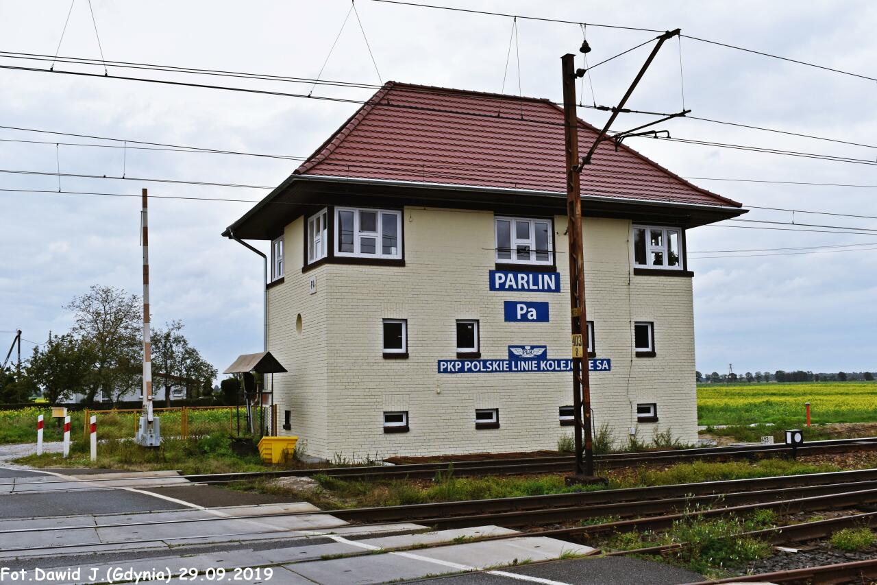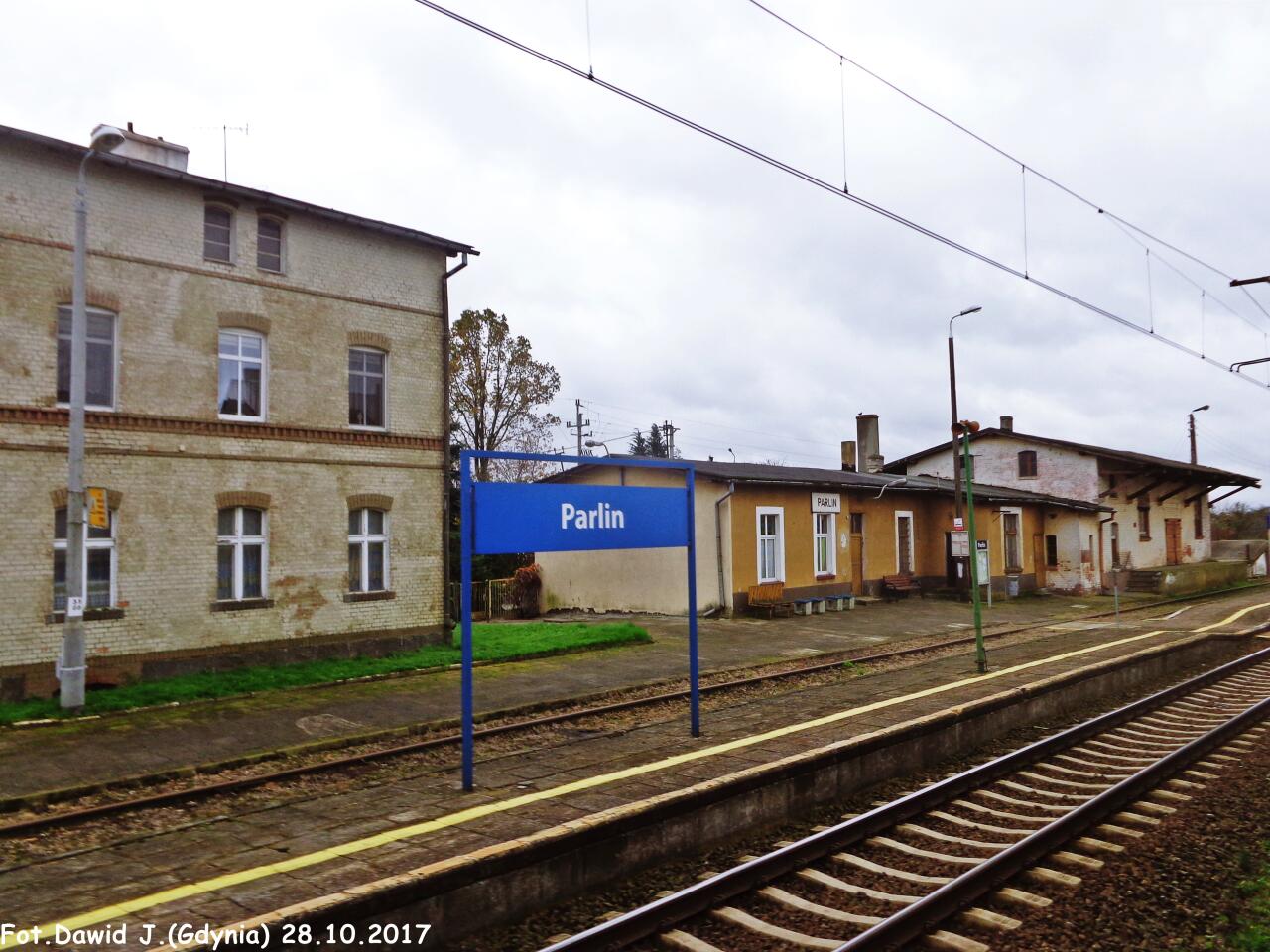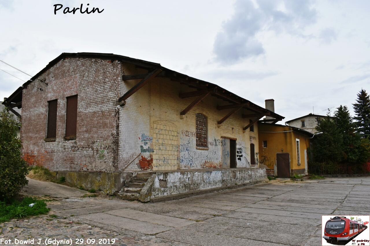 Kolejowe budynki mieszkalne (Parlin 22 i 21) i budynek dworcowy z przyległym budynkiem magazynu. Obiekty widoczne od strony torów. Widok w kierunku Terespola Pomorskiego/Tczewa.