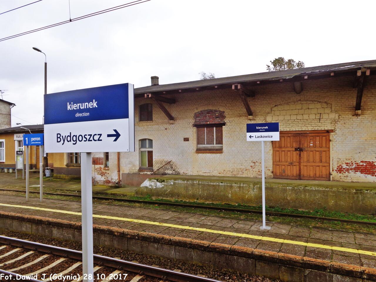 Widok z peronu 2 w kierunku Terespola Pomorskiego/Tczewa. Tablica z nazwą stacji.