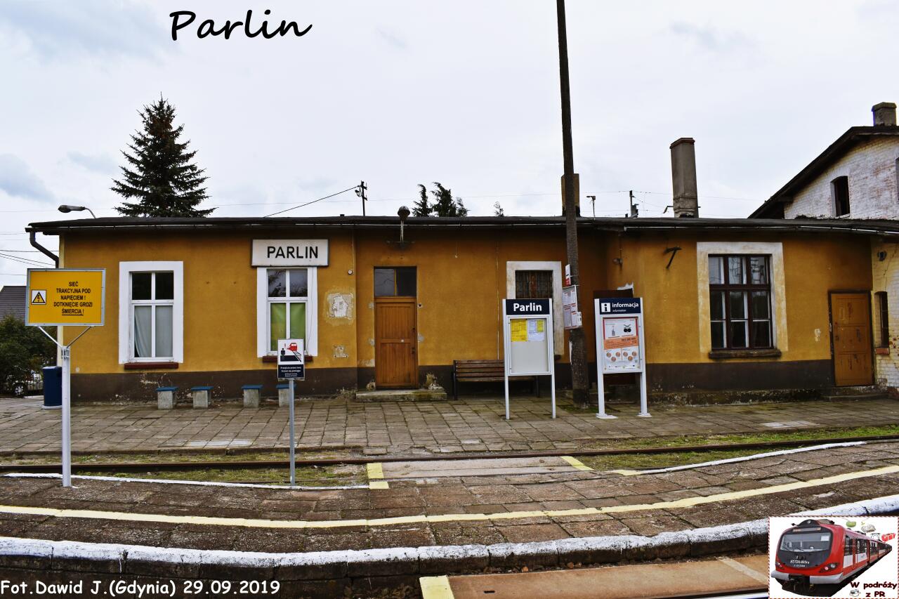 Kolejowy budynek mieszkalny (Parlin 21) i budynek dworcowy z przyległym budynkiem magazynu. Obiekty widoczne od strony torów. Tablica z nazwą stacji. W lewo Terespol Pomorski/Tczew, w prawo Maksymilianowo/Bydgoszcz Główna.