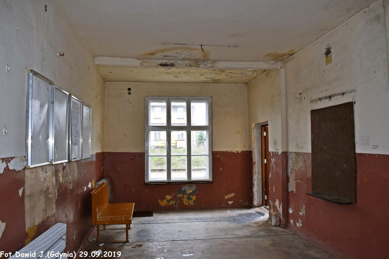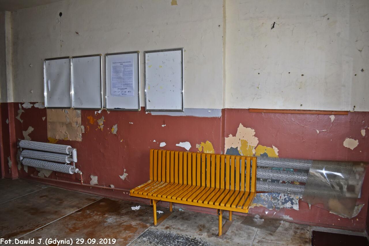 Wnętrze budynku dworcowego. Poczekalnia dla podróżnych. Nieczynne okienko kasy biletowej znajduje się po lewej stronie.