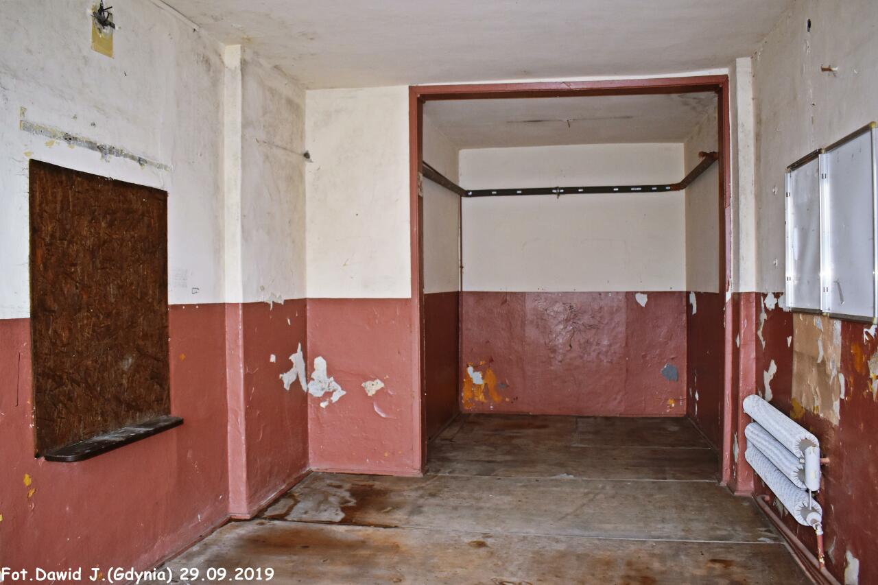 Wnętrze budynku dworcowego. Poczekalnia dla podróżnych. Nieczynne okienko kasy biletowej znajduje się po prawej stronie. Wyjście na perony.