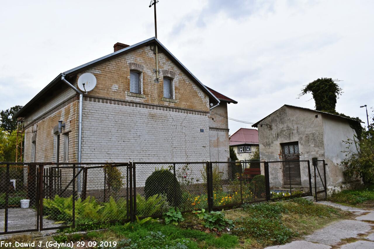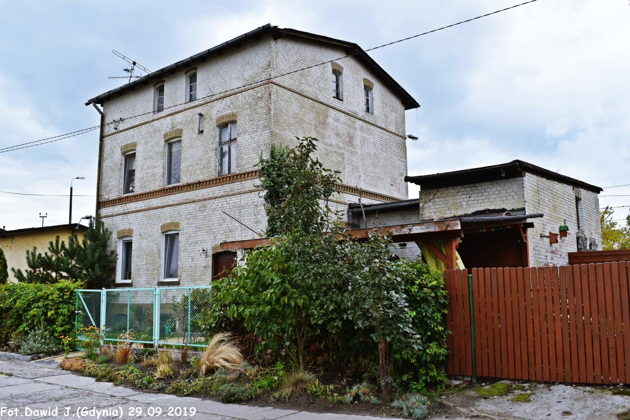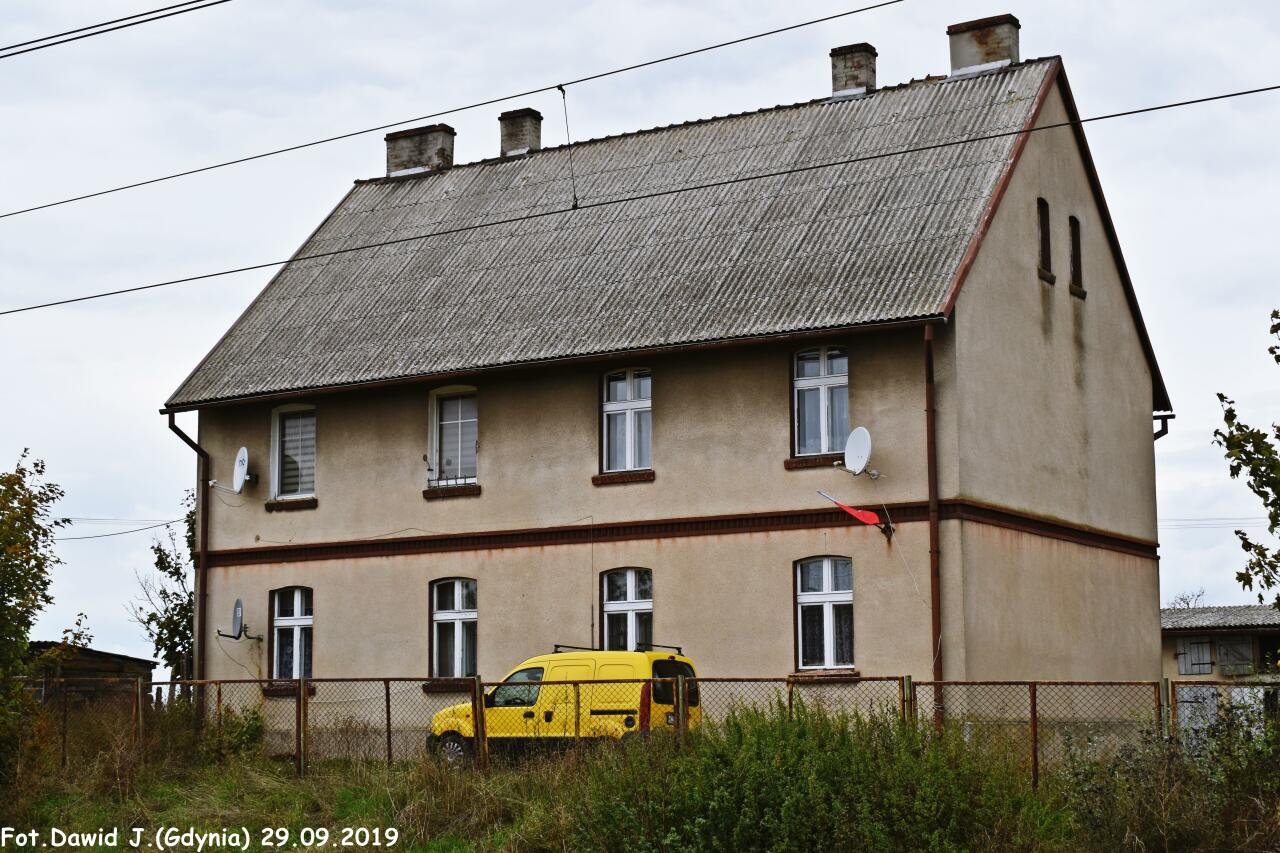 Kolejowy budynek mieszkalny (Parlin 22) widoczny od strony podjazdu. W lewo dworzec, w prawo Terespol Pomorski/Tczew.