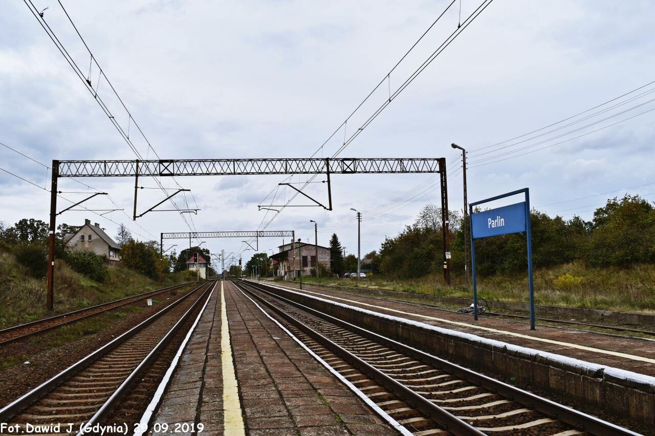 Wjazd na stację od strony Terespola Pomorskiego/Bydgoszczy. Przejazd kolejowy na lokalnej drodze. Kolejowe budynki mieszkalne (Parlin 22 i 21) i budynek dworcowy z przyległym budynkiem magazynu, znajdują się po lewej stronie. Widok w kierunku Bydgoszczy Głównej.