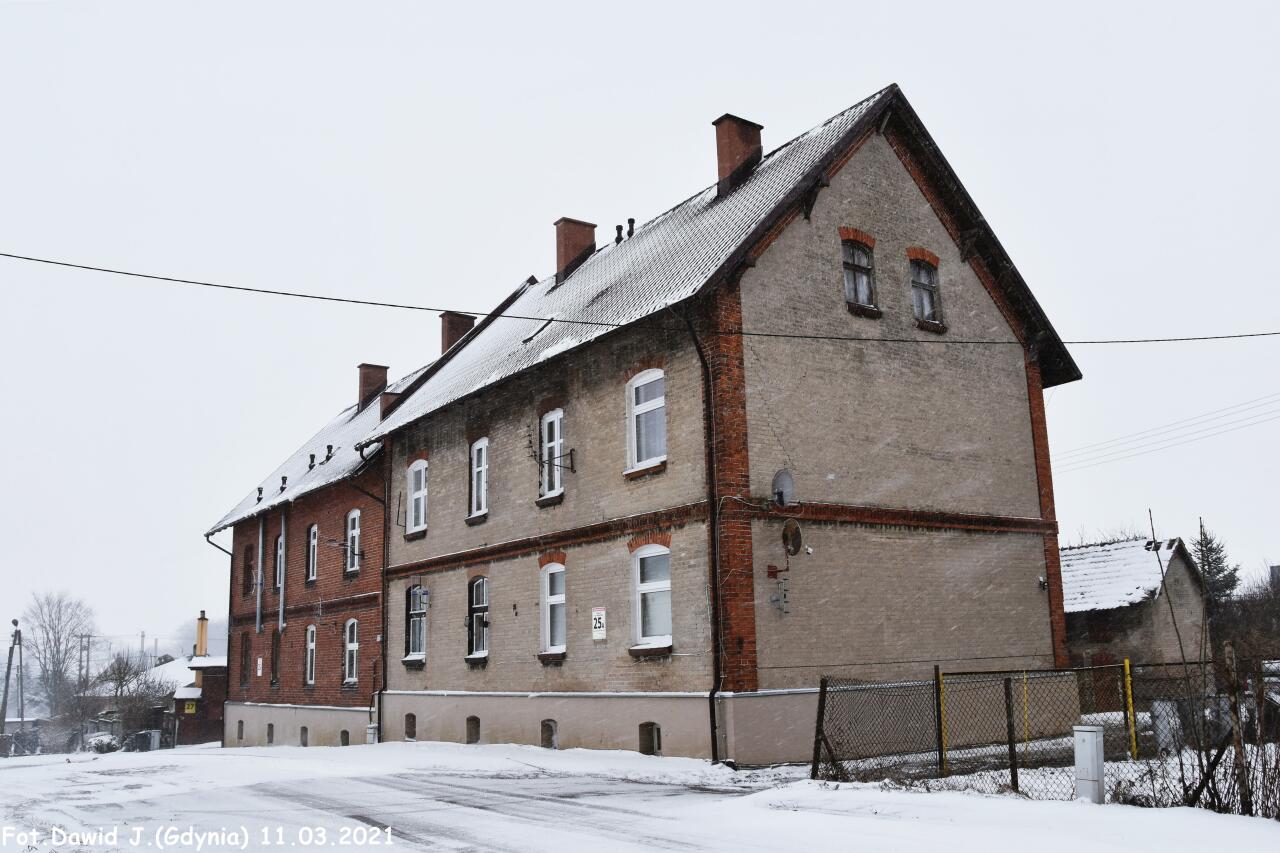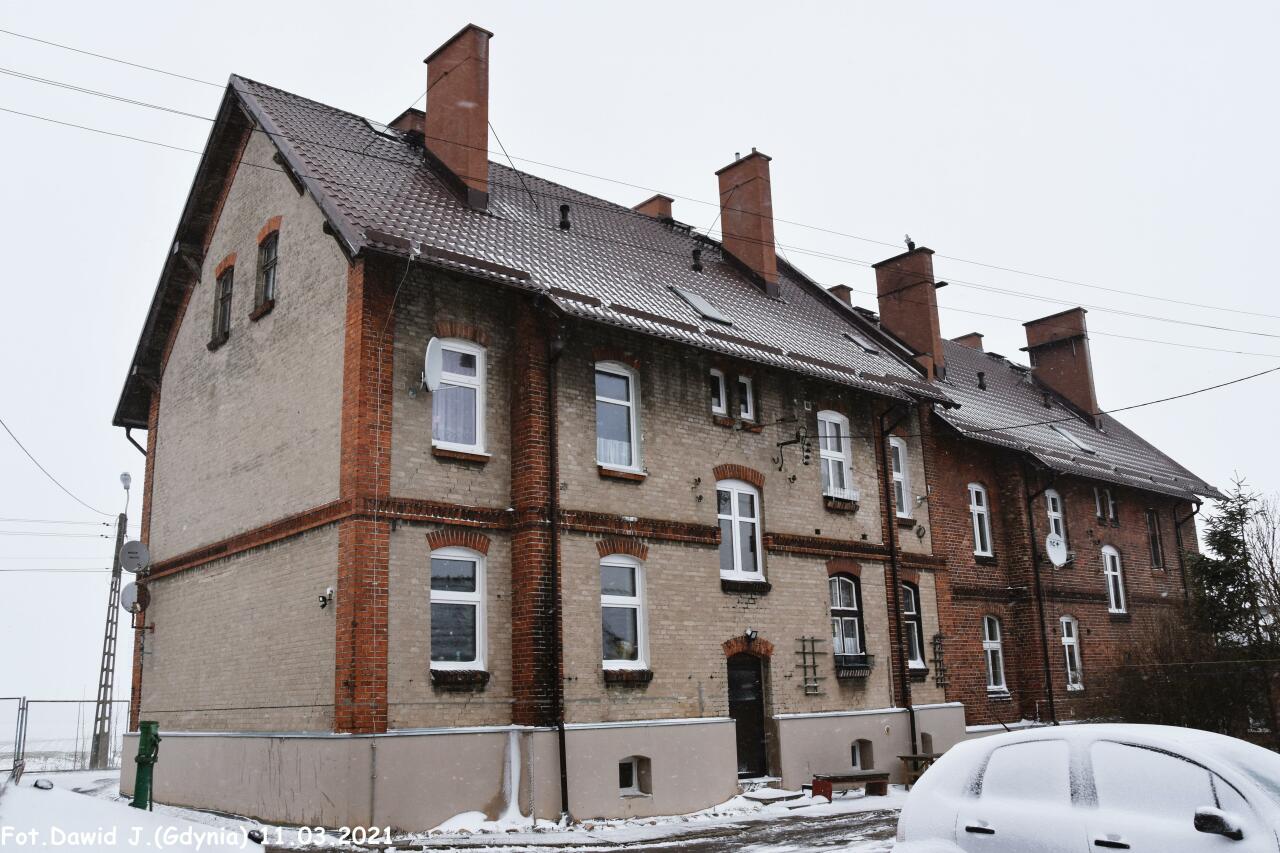 Kolejowe budynki mieszkalne, przyległe (ul. Dworcowa 25A i 25B). Obiekty widoczne od strony podjazdu. Widok w kierunku Tczewa.