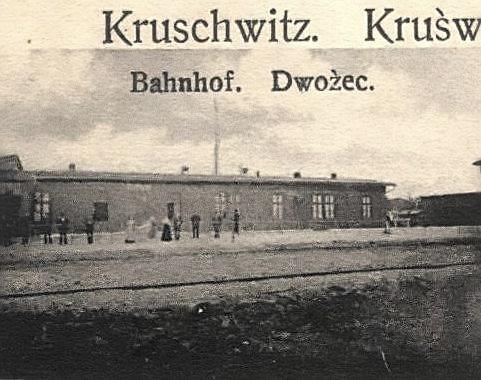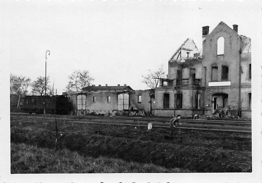 Stacja kolejowa Kruszwica. Uszkodzony budynek dworca i magazyn towarowy od strony peronów: w lewo Inowrocław, w prawo Mogilno. Na parterze, w przybudówce mieściła się nastawnia dysponująca.