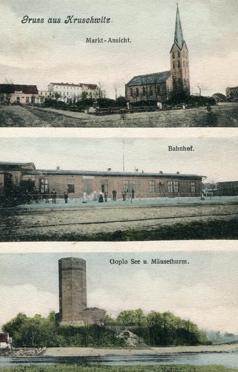 Pocztówka wielowidokowa z budynkiem dworcowym w środkowym polu. W lewo Inowrocław, w prawo Mogilno.