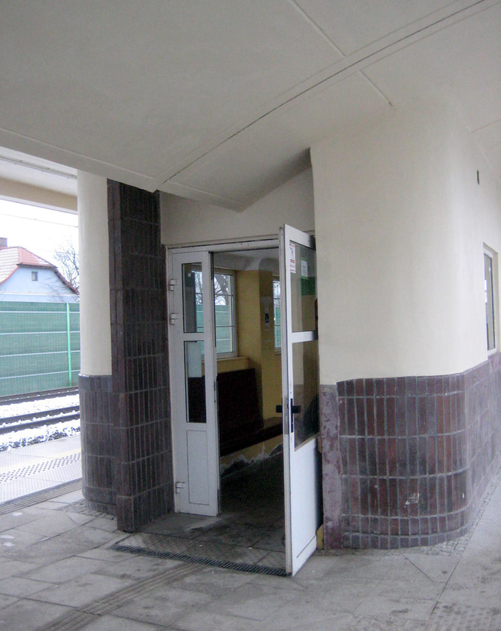 Wejście do budynku dworcowego, w którym znajduje się kasa biletowa i mała poczekalnia.