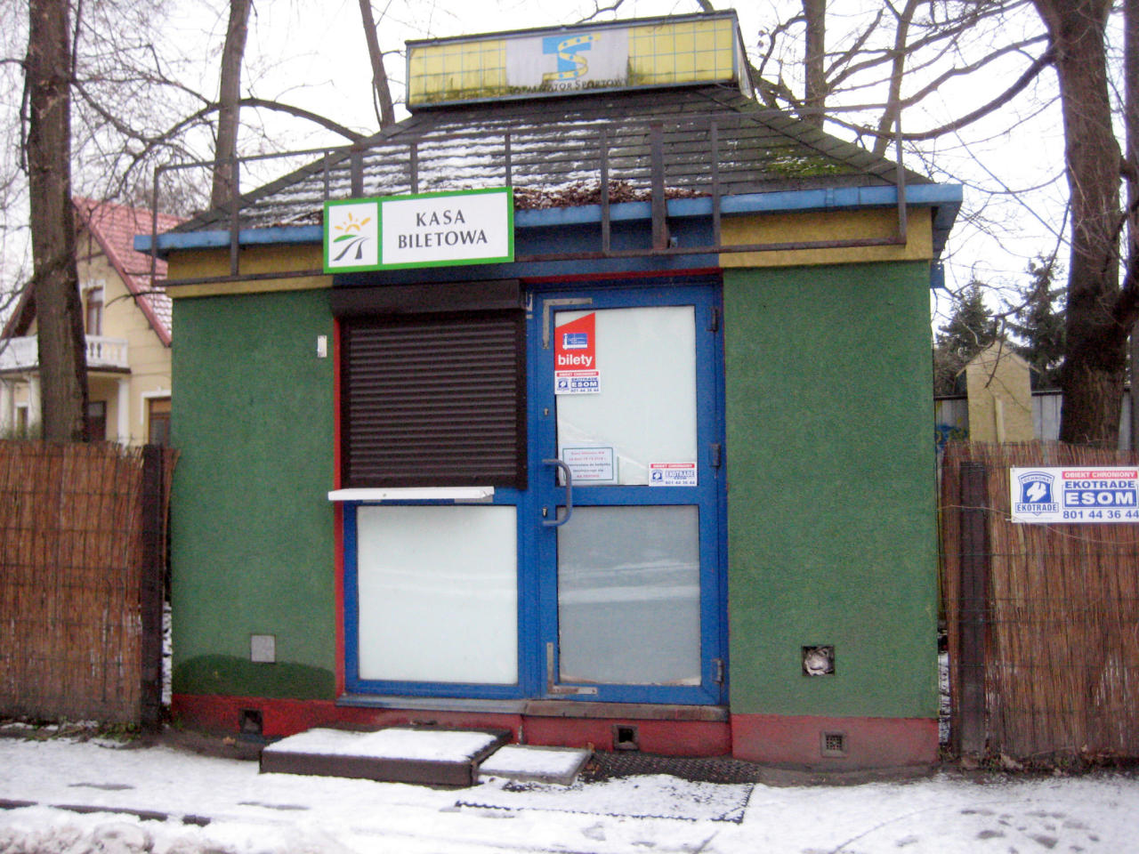 Przystanek sfotografowany z ulicy Pruszkowskiej. Widok w kierunku Pruszkowa. Pod zadaszeniem kasa biletowa.