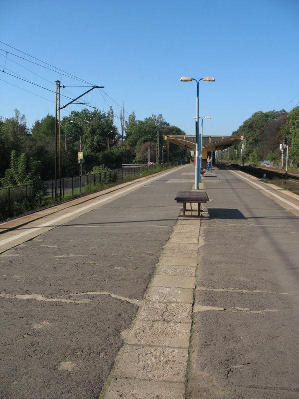 Peron. Widok w kierunku Milanówka. Widoczny wiadukt nad ulicą Wilsona. W oddali po lewej podstacja trakcyjna.