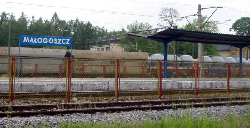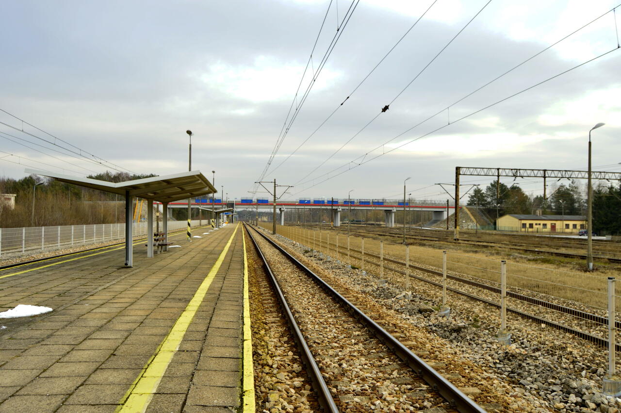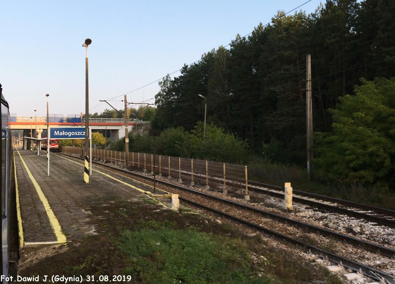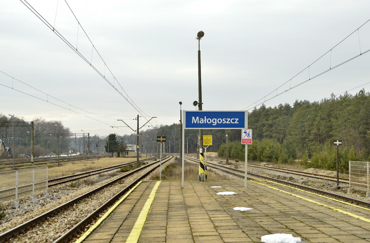 Stacja PKP Małogoszcz. Widok na peron od strony północnej. Na torami wiadukt na drodze krajowej nr 728.