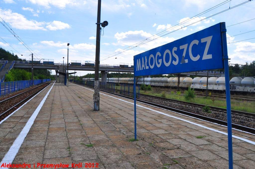 Stacja PKP Małogoszcz. Tablica przystanku i peron od strony północnej.