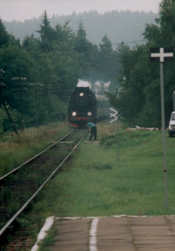 Krzeszna - odjazd "Costeriny" do Kościerzyny. Tor dodatkowy po prawej stronie już wtedy nie istniał. Widok od strony Kościerzyny.