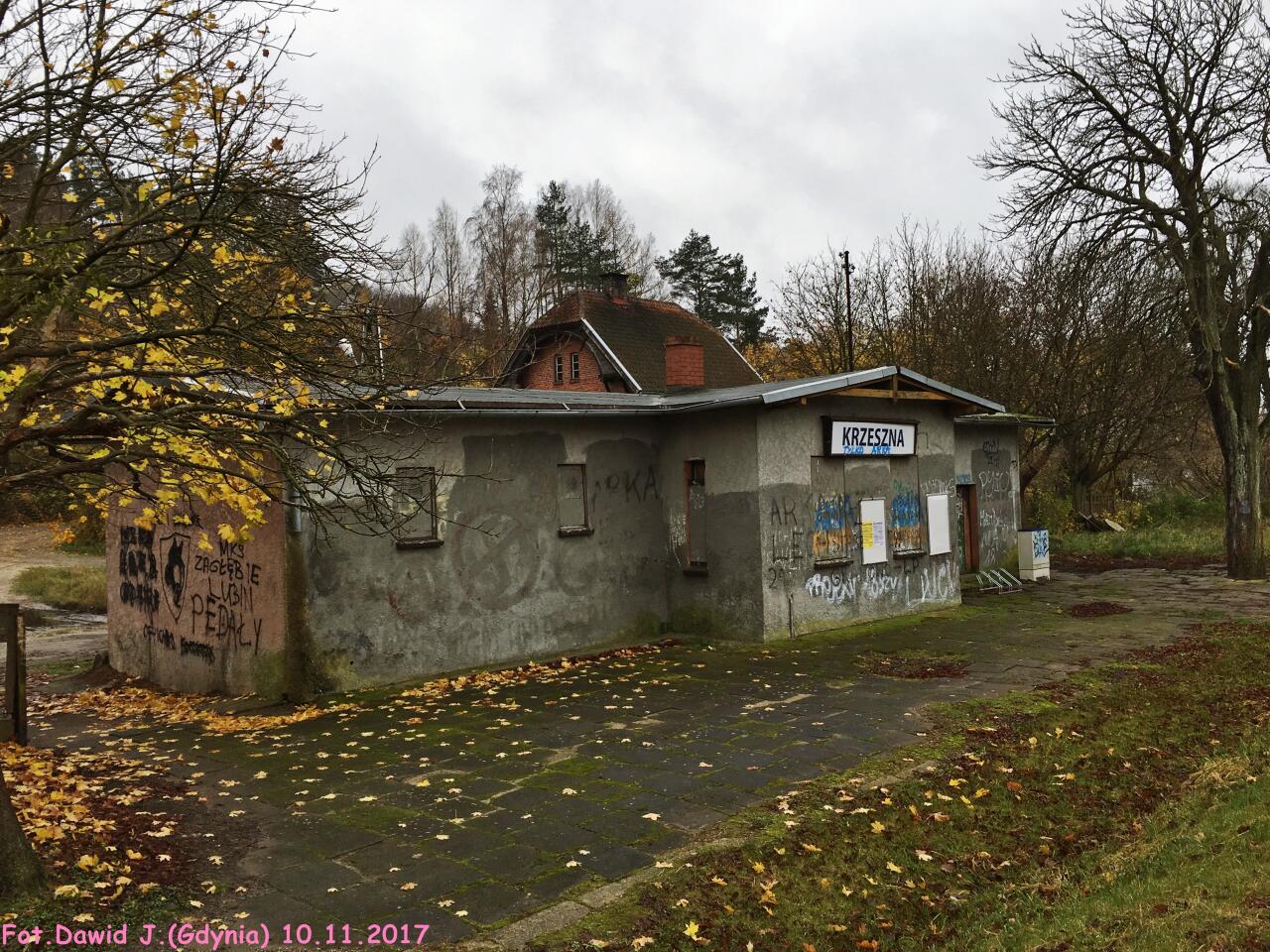 Budynek dworcowy widoczny od strony torów. W tle znajduje się kolejowy budynek mieszkalny (Krzeszna 122). W przybudówce, na parterze mieściła się nastawnia dysponująca. Na pierwszym planie rozebrany tor dodatkowy. W lewo Żukowo/Gdynia Główna, w prawo Kościerzyna/Bydgoszcz Główna.