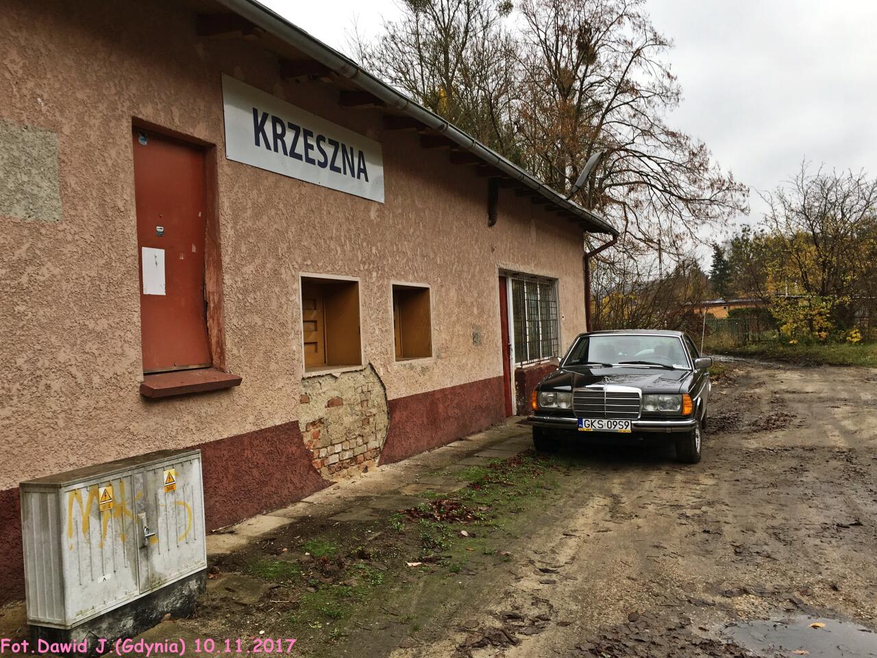 Kolejowy budynek mieszkalny (Krzeszna 122) i budynek dworcowy. Obiekty widoczne od strony podjazdu. W lewo Kościerzyna/Bydgoszcz Główna, w prawo Żukowo/Gdynia Główna.