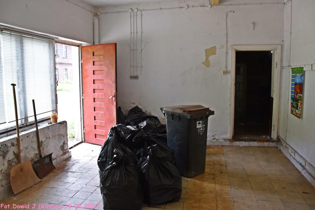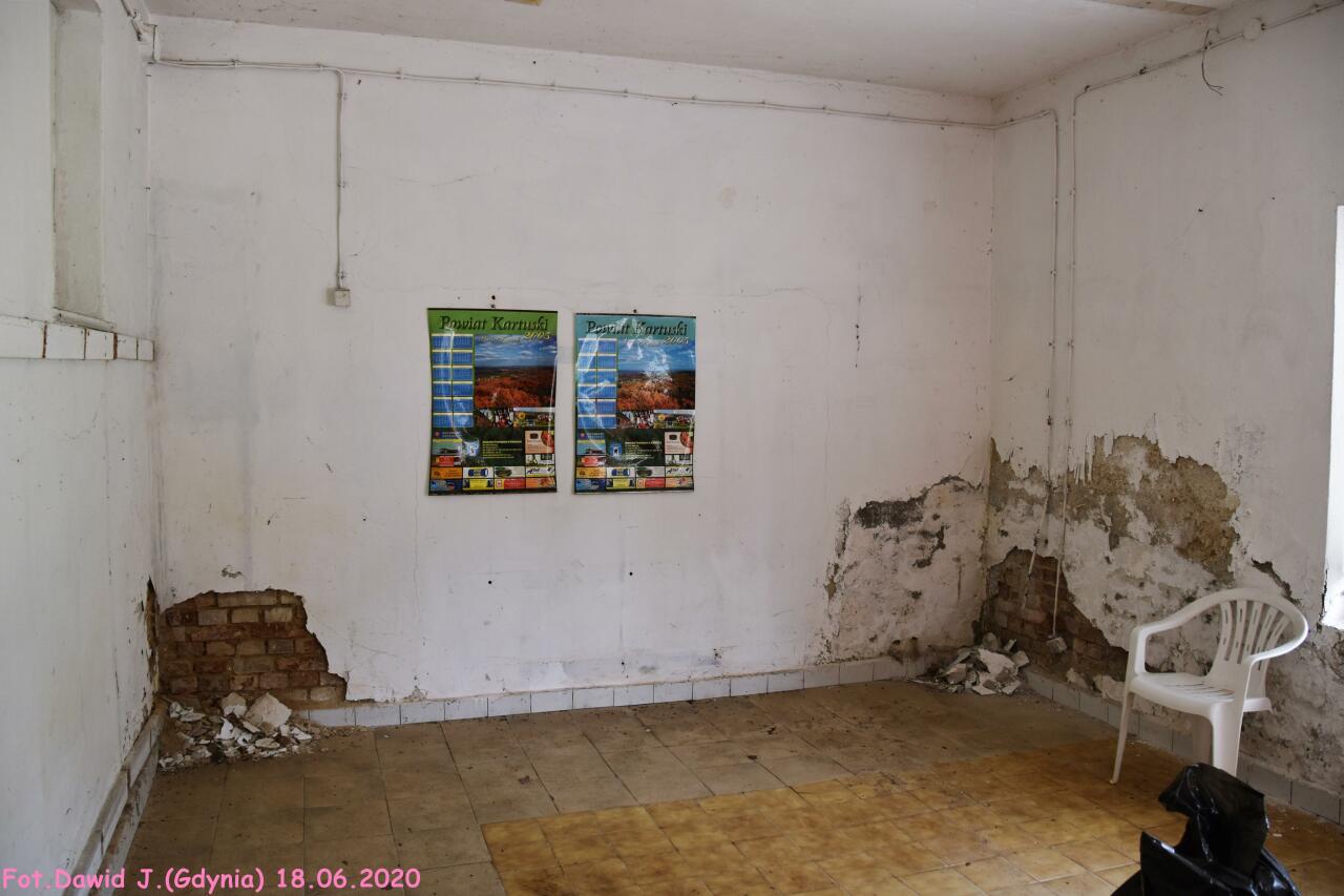 Wnętrze nieczynnego budynku dworcowego. Okienko kasy biletowej być może było w drzwiach po prawej stronie. Jakby nie patrzeć, takie detale jak okienko kasy biletowej w drzwiach również stosowano. Dobrym przykładem na to może być wspomniany sposób na dworcu w Zakrzewskiej Koloni.