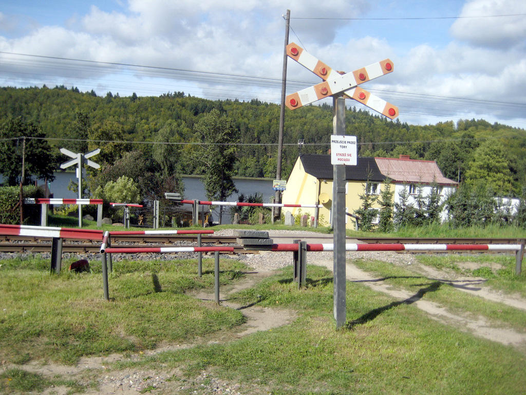 Przystanek PKP Krzeszna. Przejazd i przejście dla pieszych w kierunku Jeziora Ostrzyckiego. W lewo peron, w prawo Somonino/Gdynia.