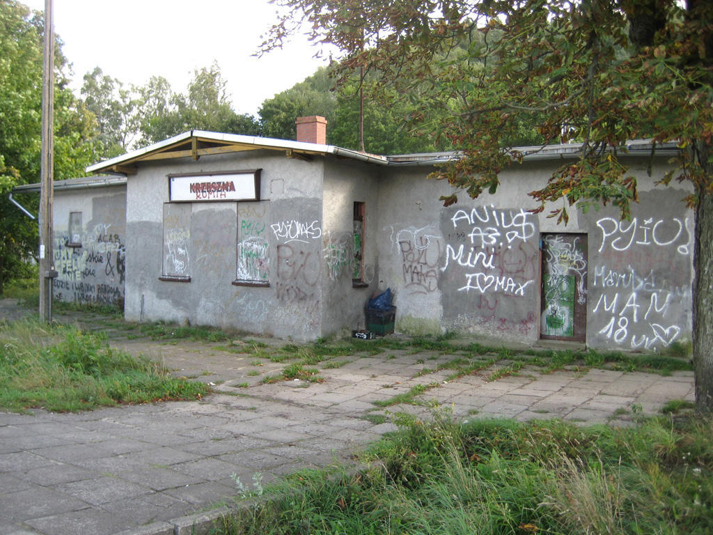 Przystanek PKP Krzeszna. Nieczynny dworzec od strony peronów. W przybudówce, na parterze mieściła się nastawnia dysponująca. W lewo Somonino/Gdynia, w prawo Kościerzyna.