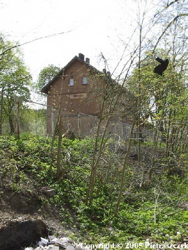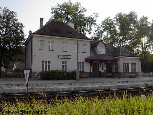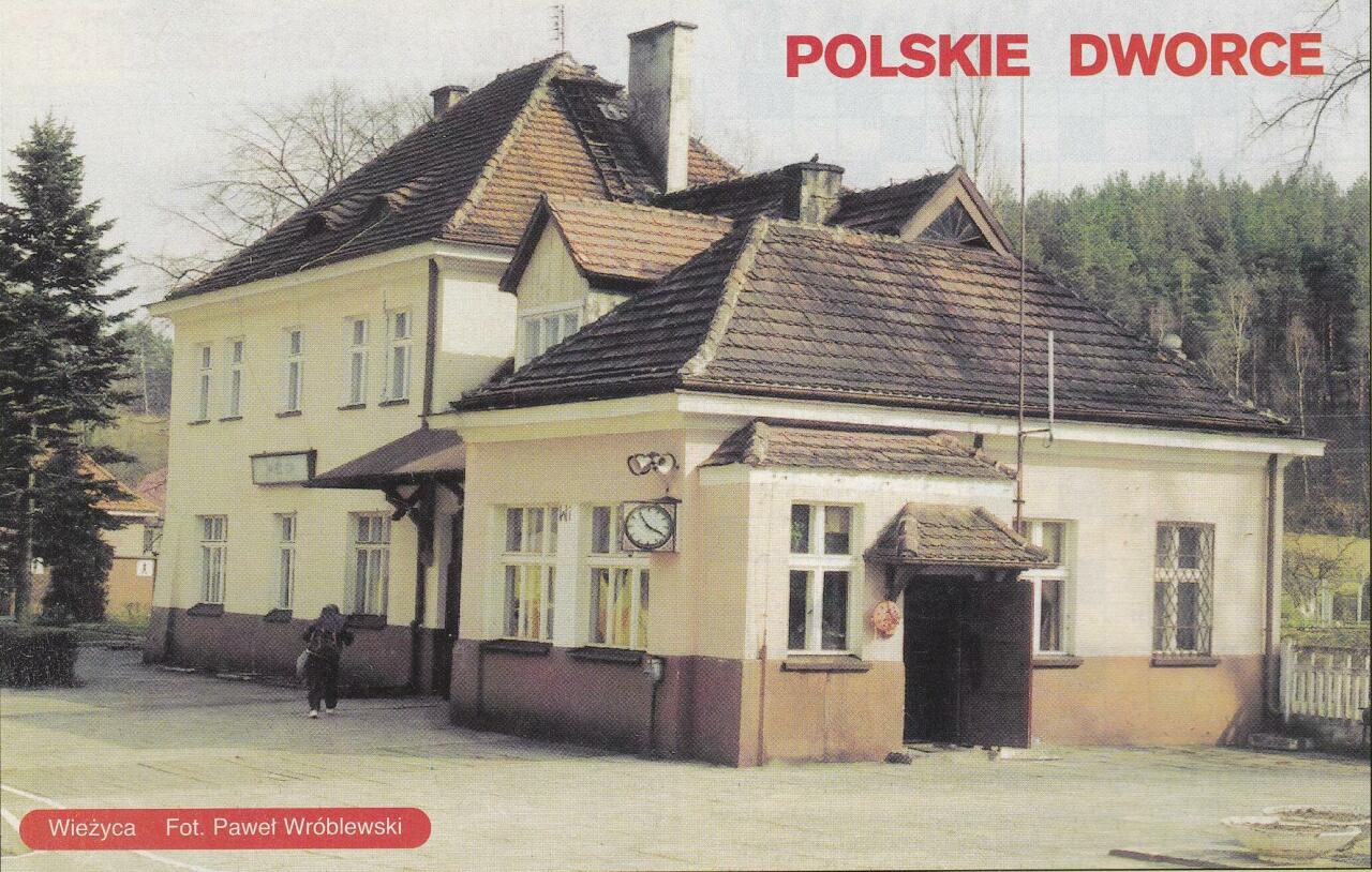 Skan zdjęcia z Nowych Sygnałów nr 47/98 przedstawiającego budynek dworcowy w Wieżycy. Po prawej przybudówka, w której mieściła się nastawnia dysponująca. Widok od strony Kościerzyny/Bydgoszczy.