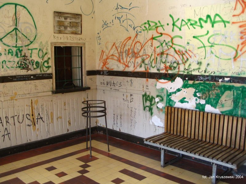 Budynek dworca - poczekalnia i nieczynne okienko kasowe.