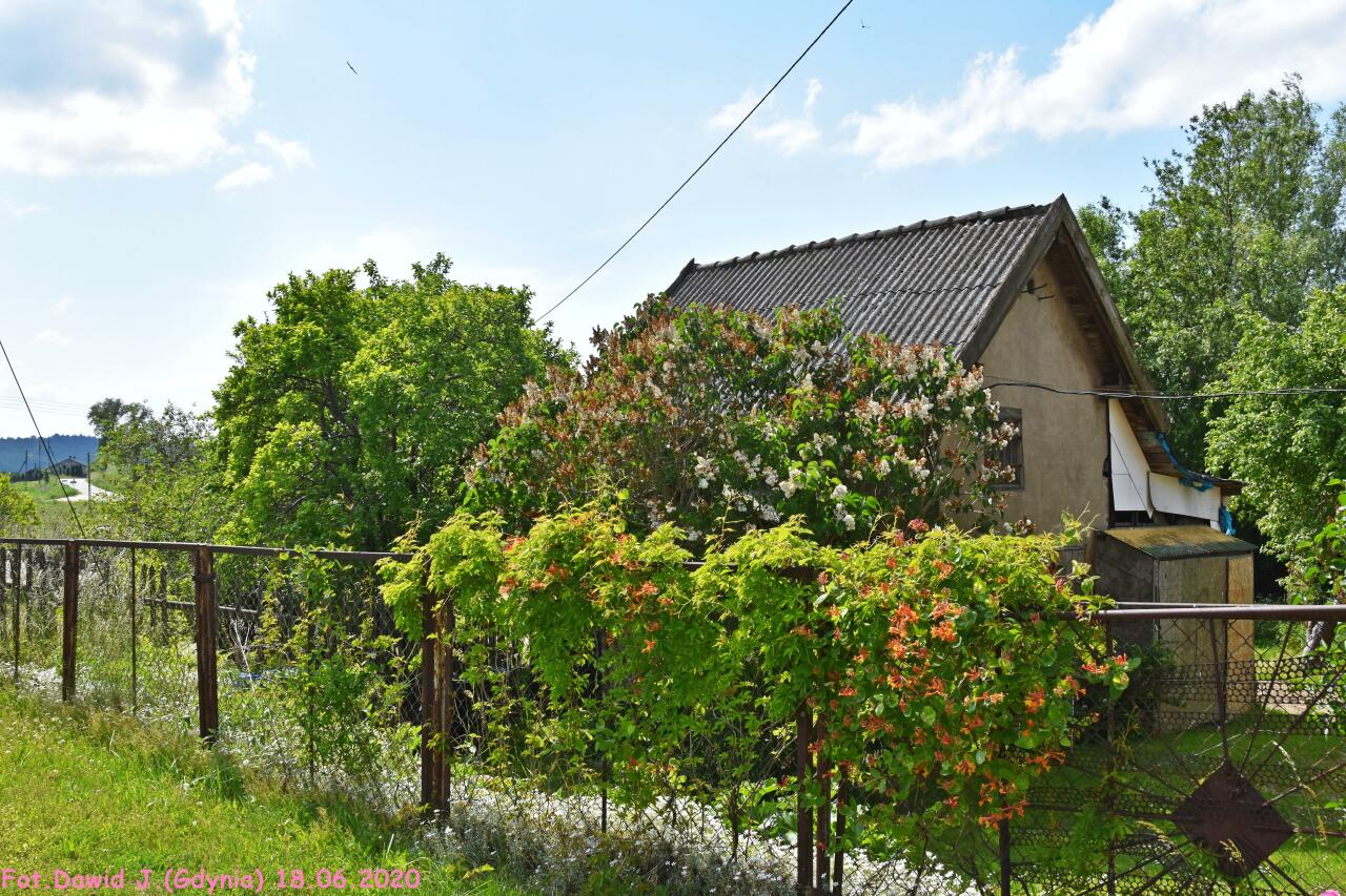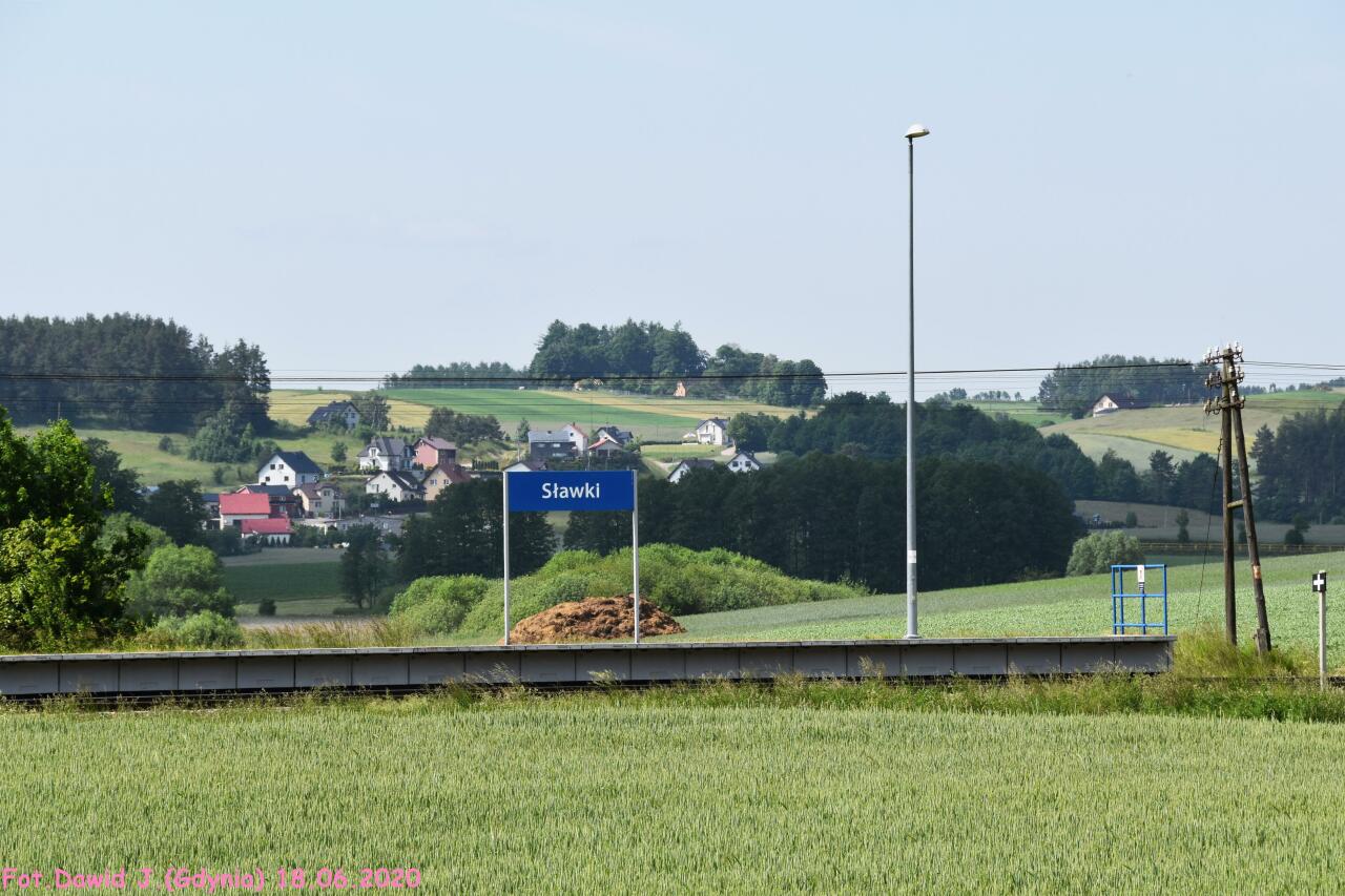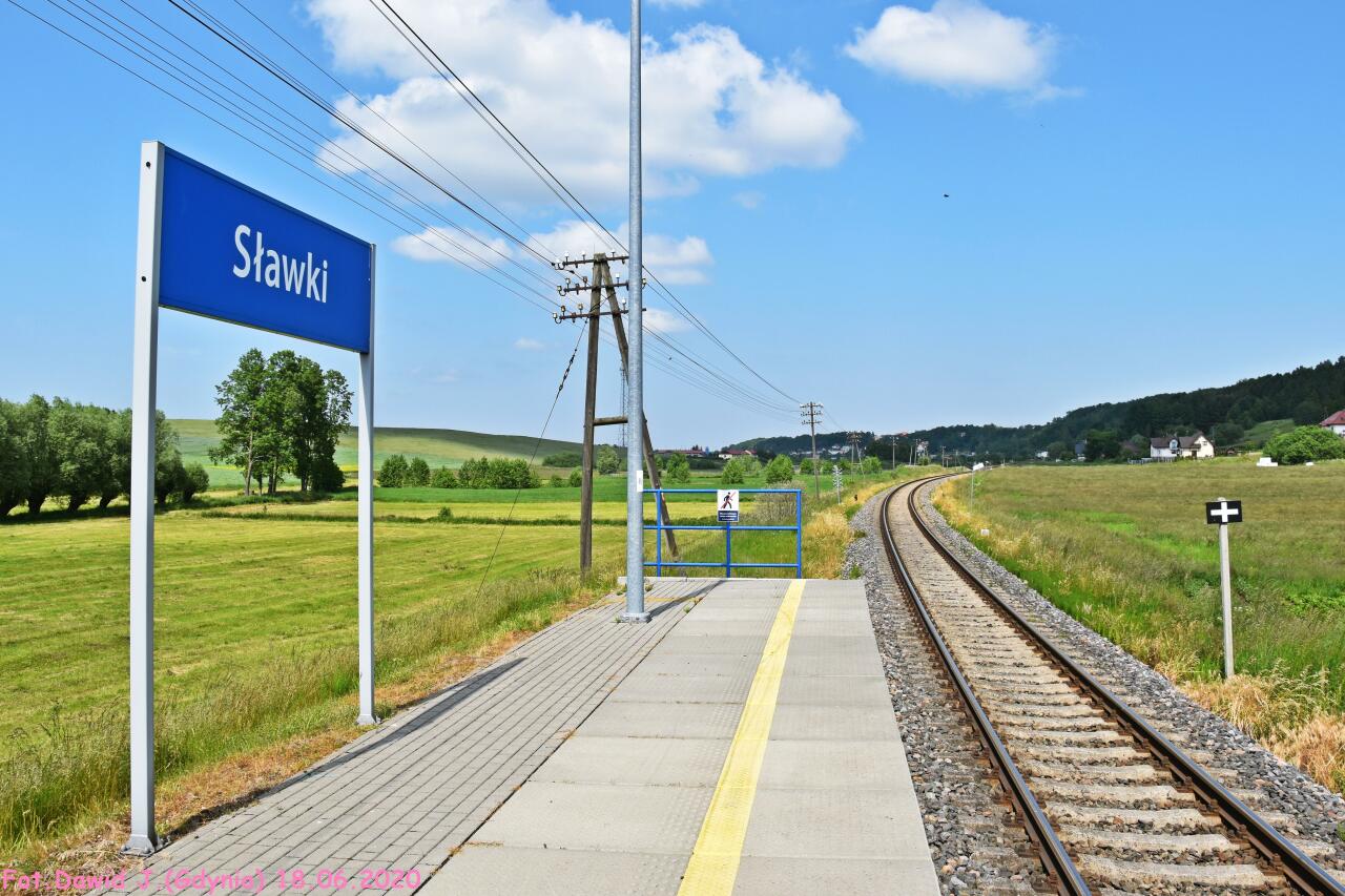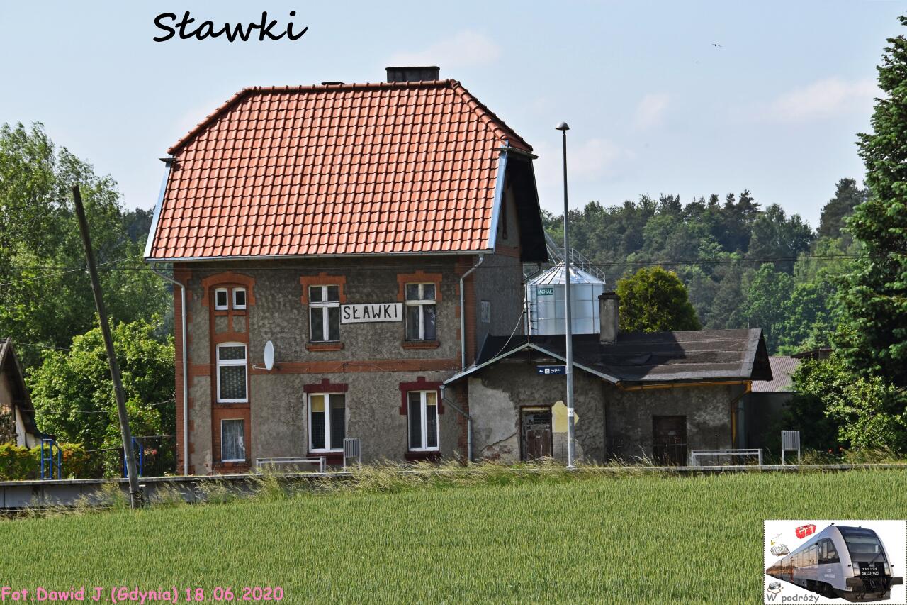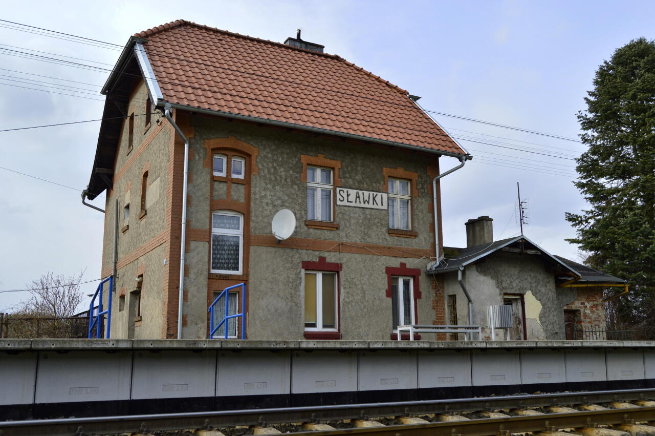 Przystanek PKP Sławki. Fragment kolejowego budynku mieszkalnego widziany z pociągu relacji Gdynia Główna - Kościerzyna: w lewo Kościerzyna, w prawo Somonino/Gdynia.