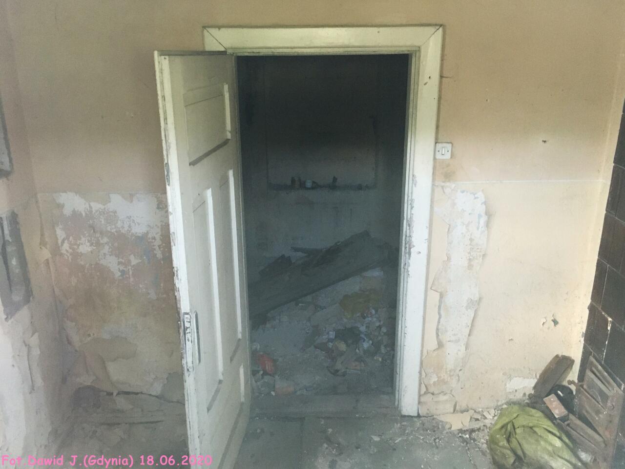 Wejście na peron. Kolejowy budynek mieszkalny z przyległym budynkiem dworcowym, znajduje się po lewej stronie. Widok w kierunku Żukowa/Gdyni Głównej.