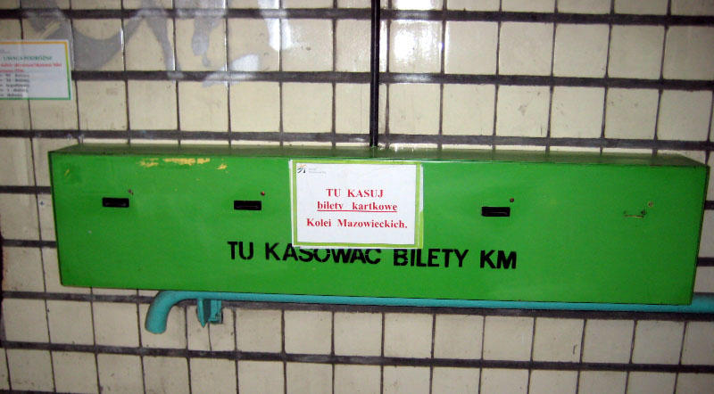 Przystanek PKP Warszawa Stadion. W przejściu podziemnym umieszczono kasowniki do biletów kartkowych Kolei Mazowieckich.