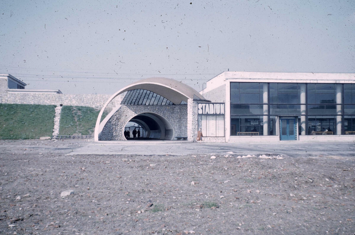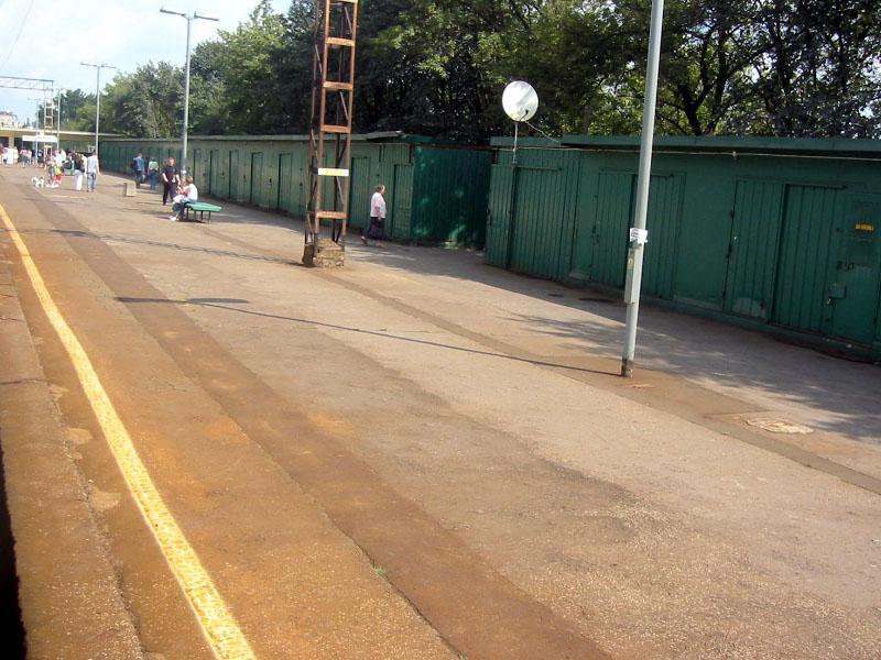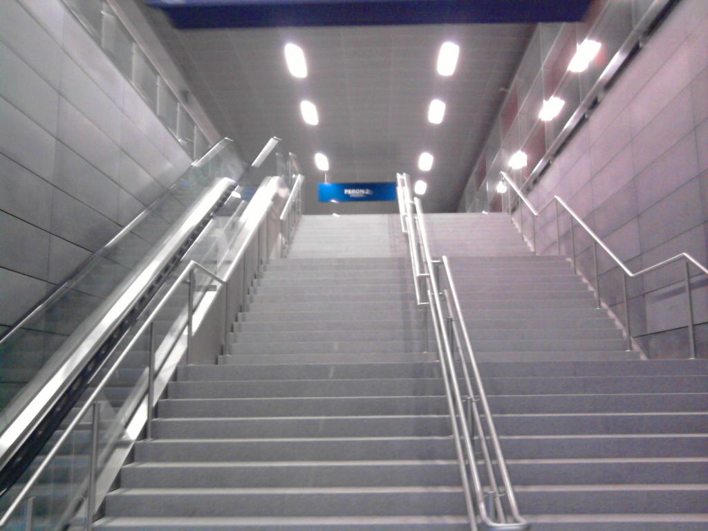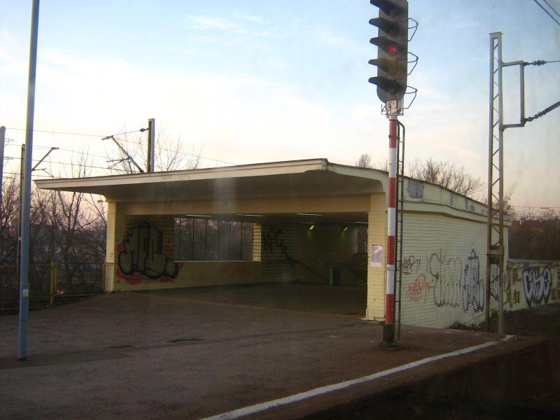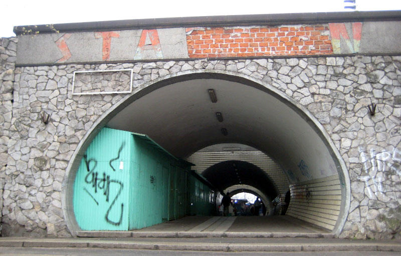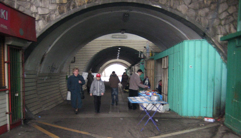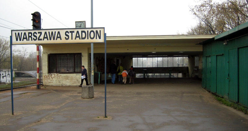 Przystanek PKP Warszawa Stadion. Wejście z peronu 1 do przejścia podziemnego. Charakterystyczną cechą tego peronu jest prawa ściana zbudowana z magazynów towarów handlarzy największego targowiska Europy Wschodniej. Ściana ta ciągnie się wzdłuż całego peronu.