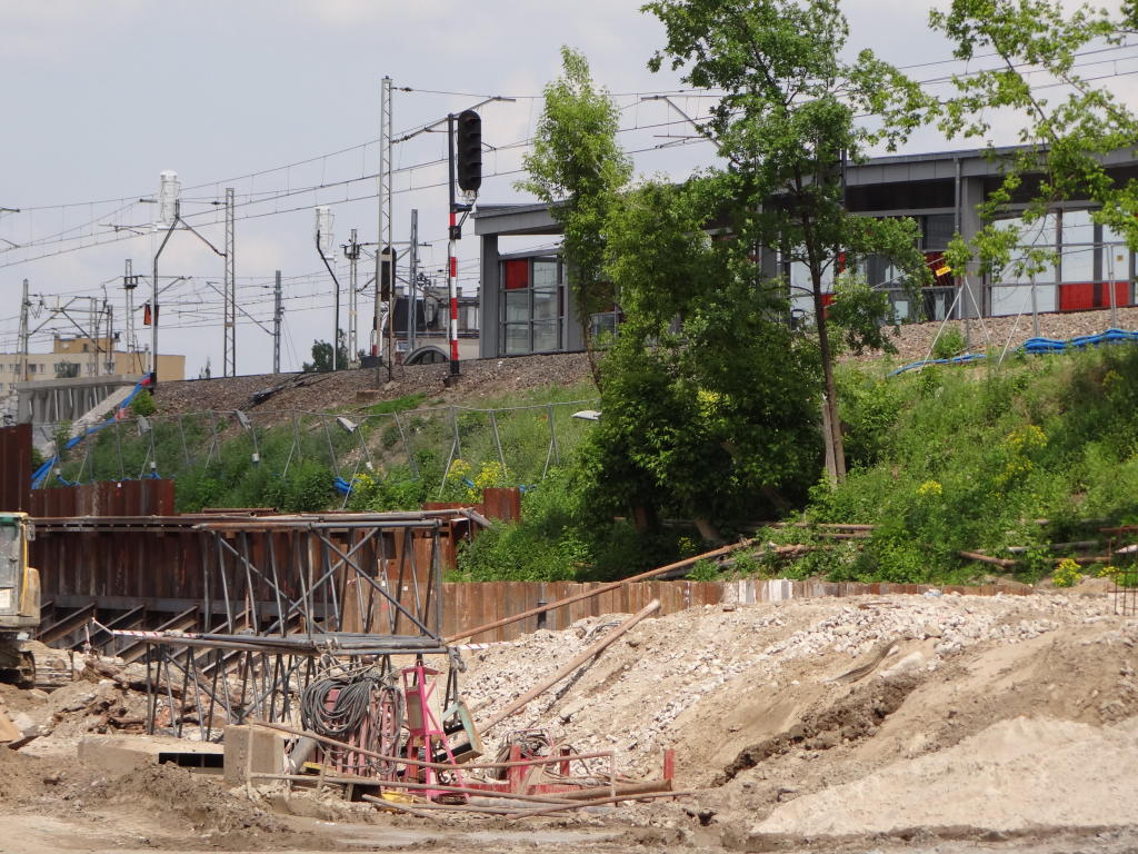 Nasyp o wysokości około 6 m. Przed nasypem budowa II linii metra. Widoczne semafory wjazdowe stacji Warszawa Wschodnia od strony Warszawy Centralnej. Widok w kierunku Warszawy Wschodniej. 3,2 km.