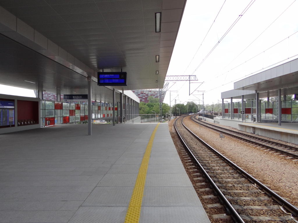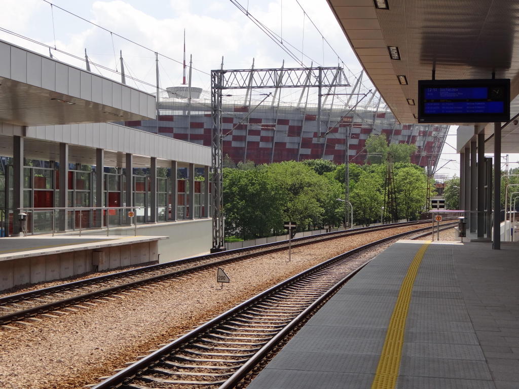 Po prawej peron dla pociągów w kierunku Warszawy Śródmieście. Widoczny Stadion Narodowy imienia Kazimierza Górskiego. W tym miejscu w latach 1955-2008 znajdował się Stadion Dziesięciolecia, który dał nazwę pobliskiemu przystankowi kolejowemu. Widok w kierunku Warszawy Śródmieście. 3,1 km.